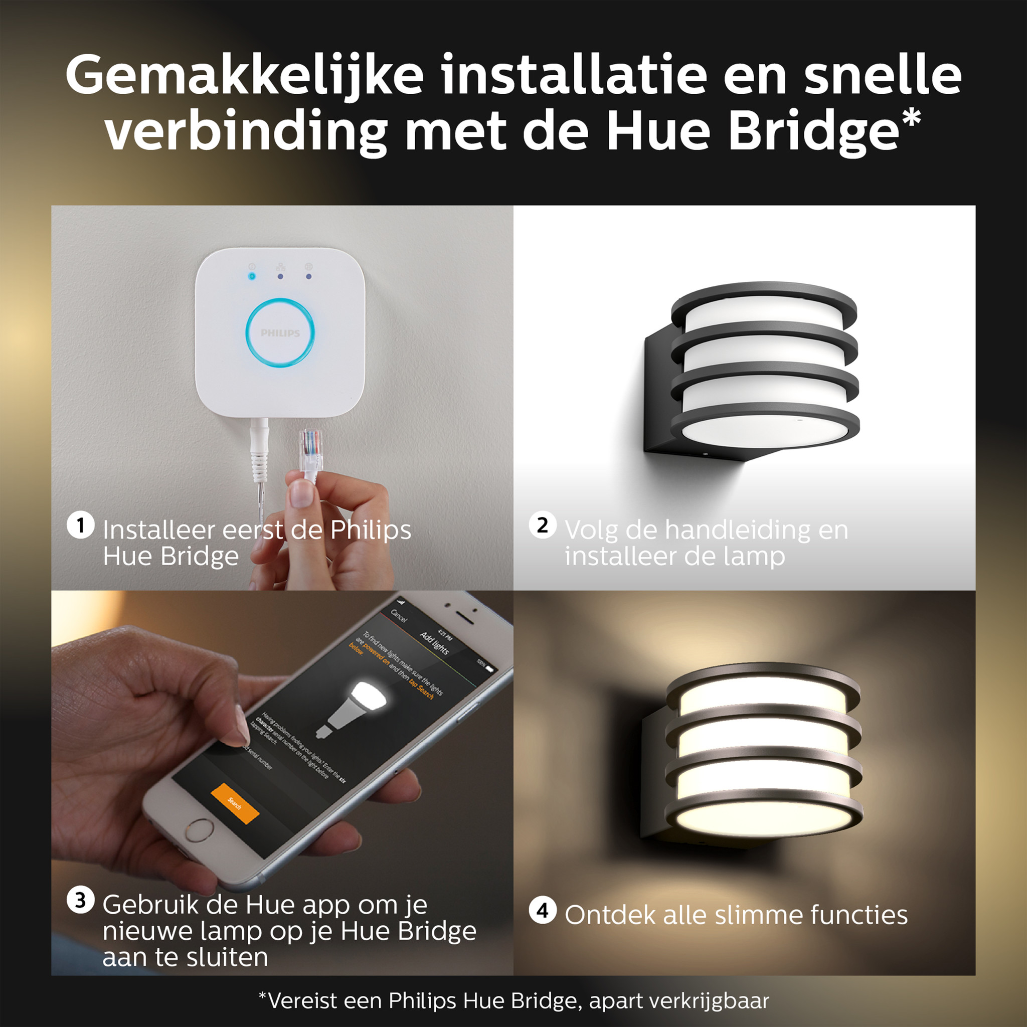 Breid je Hue-systeem nu uit naar buiten. De Lucca wandlantaarn kan rechtstreeks worden gekoppeld aan je bestaande Hue bridge, voor toegang tot alle functies – van bediening als je niet thuis bent tot geofencing-technologie en planning. De Hue bridge wordt niet meegeleverd.