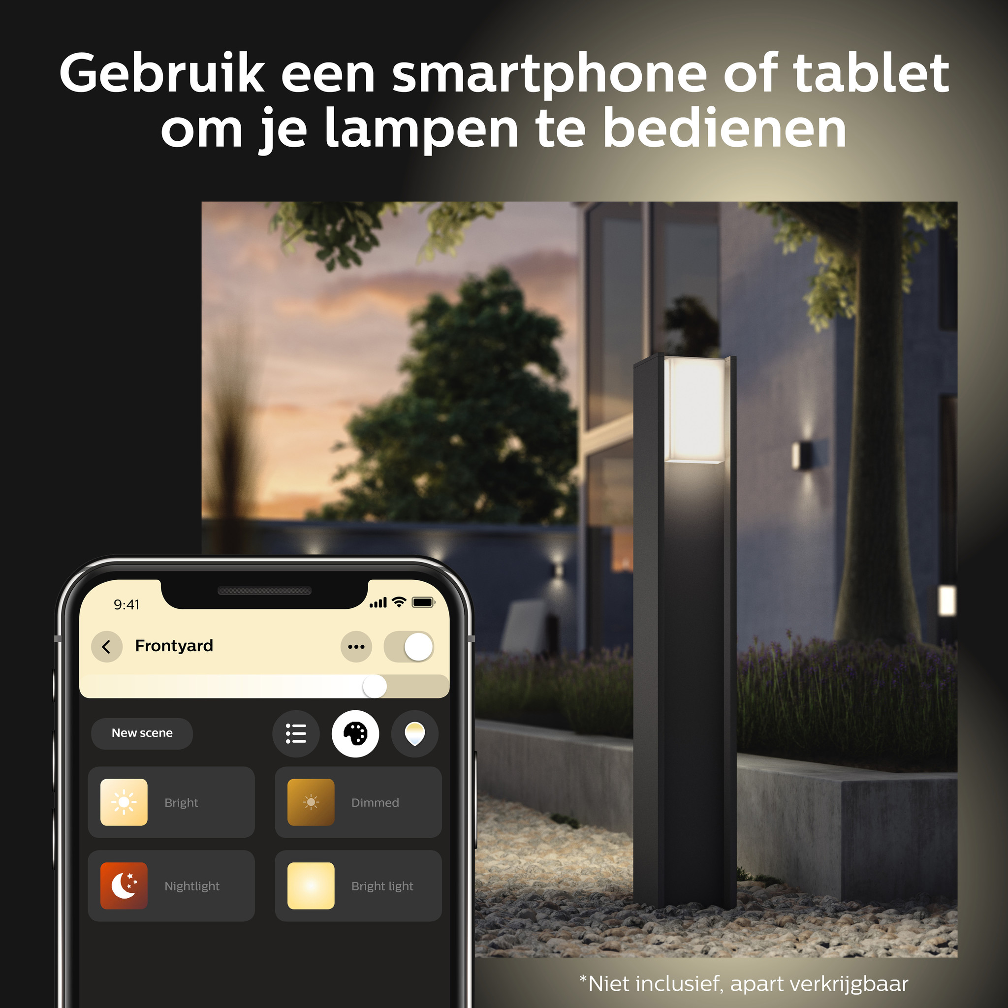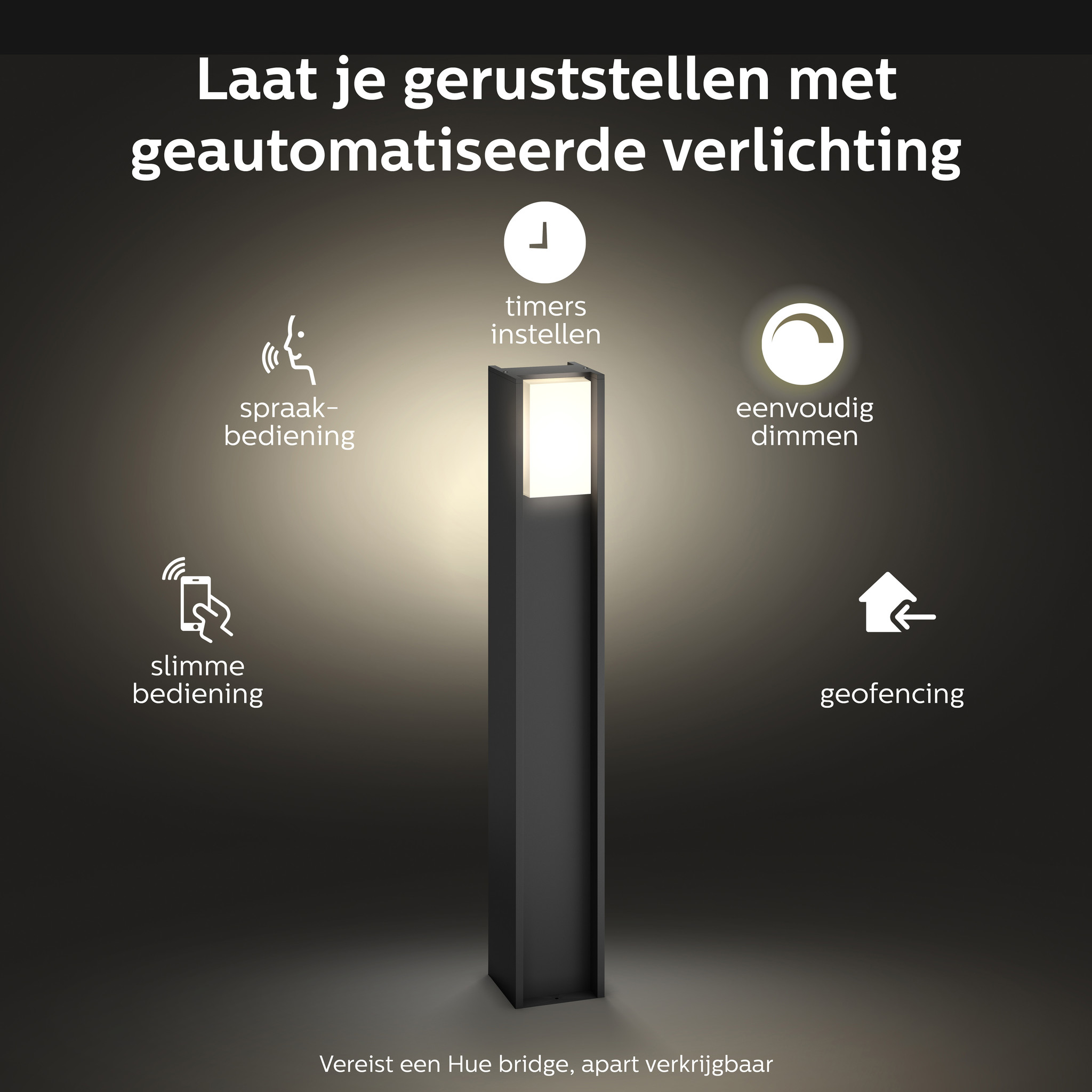 Breid uw Hue-systeem nu uit naar buiten. De Turaco-lamp op sokkel kan rechtstreeks worden gekoppeld aan uw bestaande Hue Bridge, voor toegang tot alle functies – van bediening als u niet thuis bent tot geofencing-technologie en planning. Hue Bridge niet meegeleverd.
