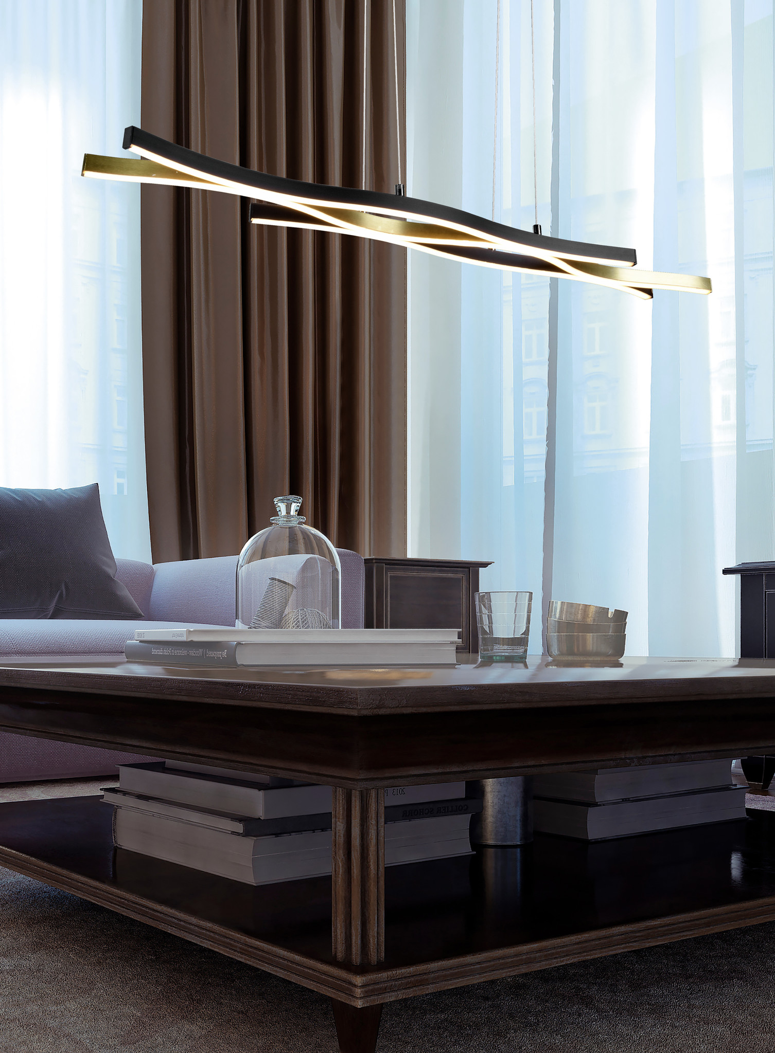 De hanglamp heeft een lengte van 107,5 cm, een breedte van 15 cm en een verstelbare hoogte tot maximum 150 cm. De lamp is voorzien van een LED lichtbron van 35 Watt en door middel van de DIP Switch kunnen er 3 lichtkleuren (warm wit 2300K, neutraal wit 3000K en daglicht wit 4000K) via een schakelaar direct op de lamp ingesteld worden. De lichtsterkte kan via de normale lichtschakelaar op 3 verschillende niveaus ingesteld worden.