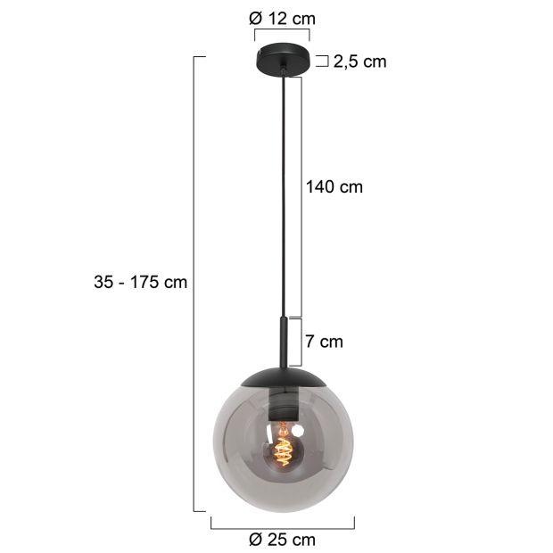 De zwart kleurige plafondplaat heeft een diameter van 12 cm. De lamp is in hoogte verstelbaar van minimaal 30 cm tot maximaal 150 cm. De lamp wordt geleverd exclusief lichtbron. De lamp is eventueel dimbaar met een externe dimmer (wanddimmer), afhankelijk van de gekozen E27 lichtbronnen. In deze lamp adviseren wij de E27 P45 lichtbronnen. Dit in verband met de opening in het glas.