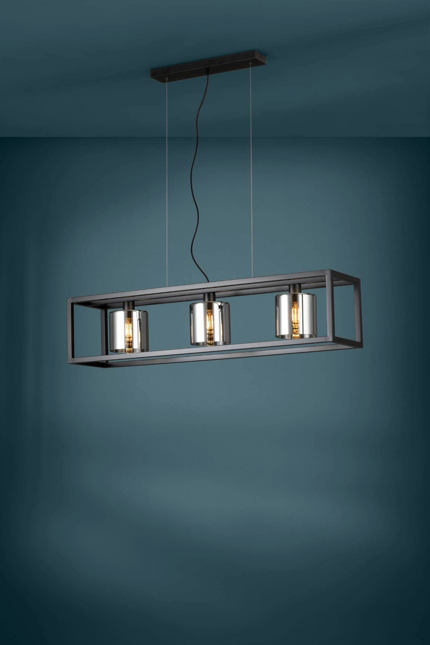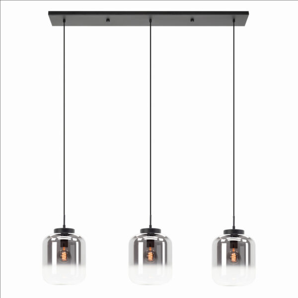 De hanglamp is uitgevoerd in het zwart staal met een mooi zwart glas. De lamp heeft een maximale hoogte van 110 cm, een breedte van 25 cm en een lengte van 110 cm.