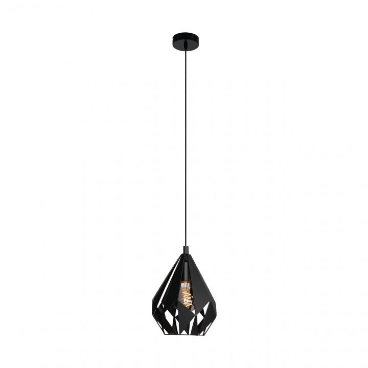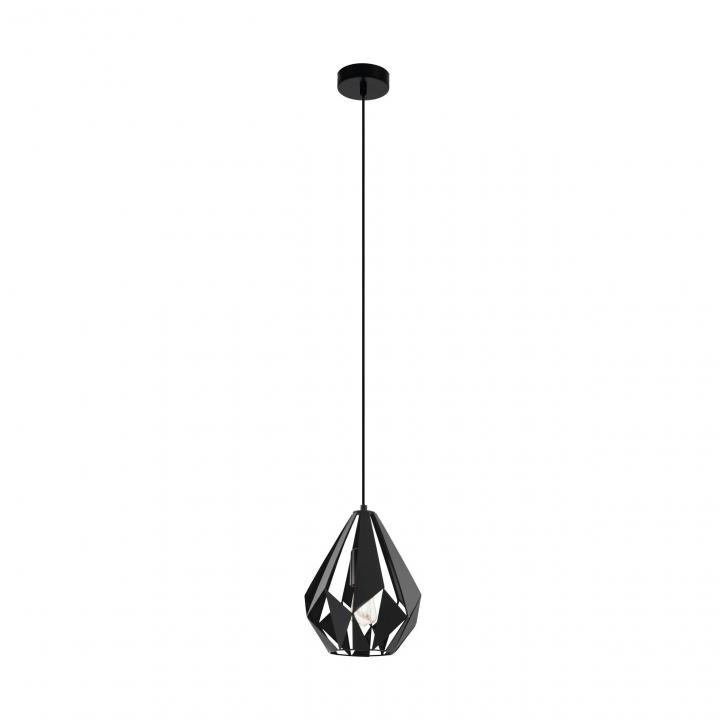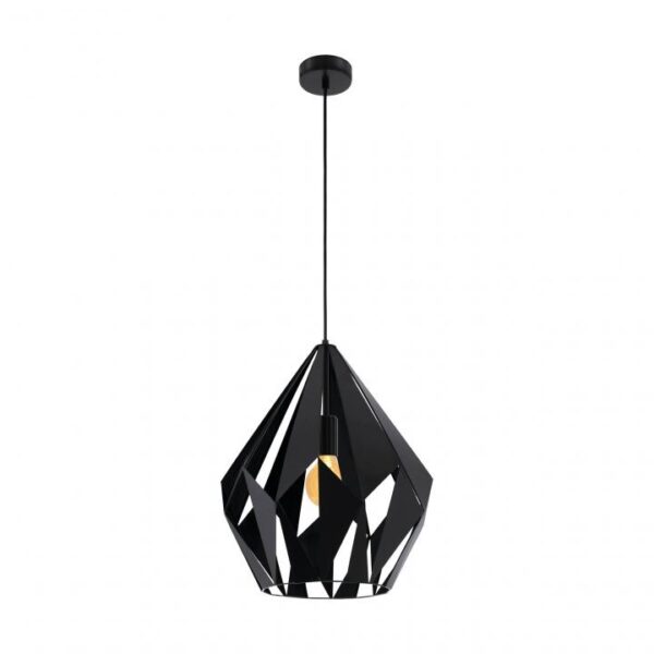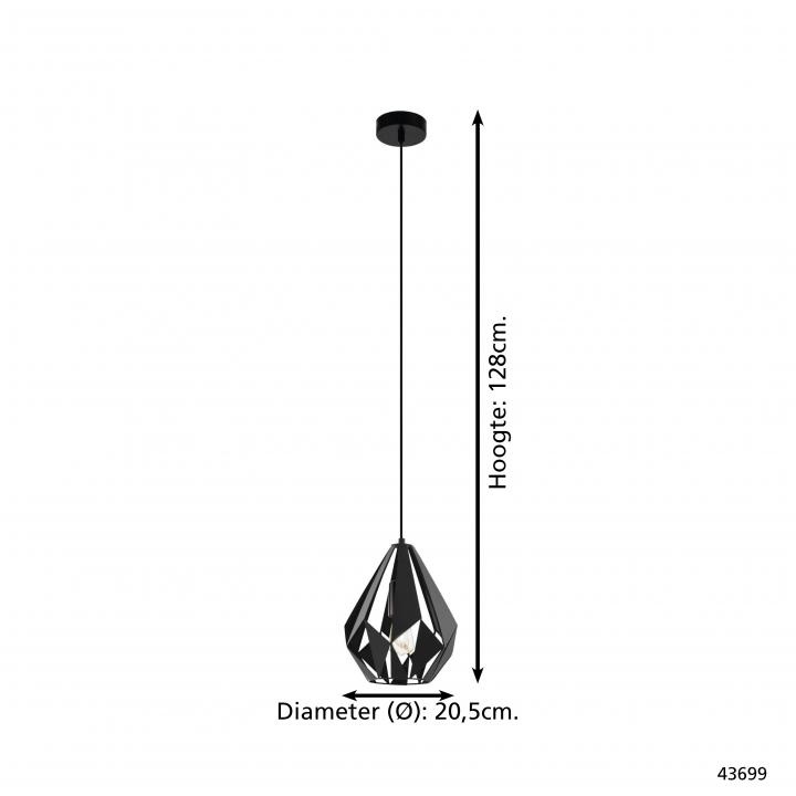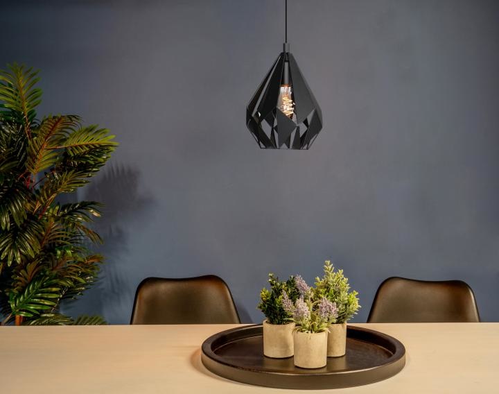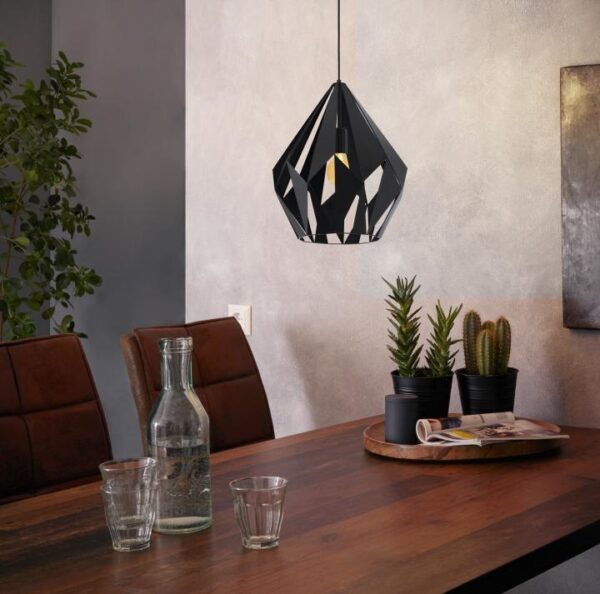 Deze trendy hanglamp komt uit de Carlton serie van Eglo. Naast de zwart/koper en de zwart/zilver versie, is de Carlton serie nu ook uitgebreid met een geheel zwarte versie.