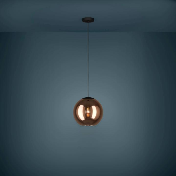 De 1-lichts hanglamp Cordoba heeft een glazen bol in koperkleur. De glazen bol is semi-transparant. De koperkleur zorgt voor een mooie warme gloed en zacht sfeervol licht als de lamp aan staat.