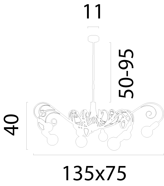 De lamp is uitgerust met 8 x een E27 fitting (lichtbron exclusief). De lamp is in hoogte verstelbaar tot maximaal 135cm. De lamp is 135cm breed en 75cm diep. De hanglamp Curlie is eventueel te dimmen met een externe dimmer (exclusief).