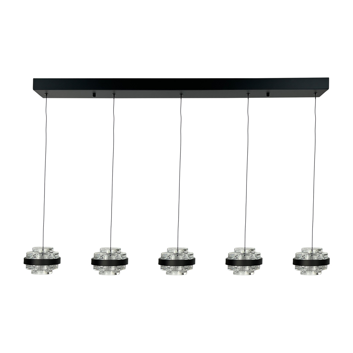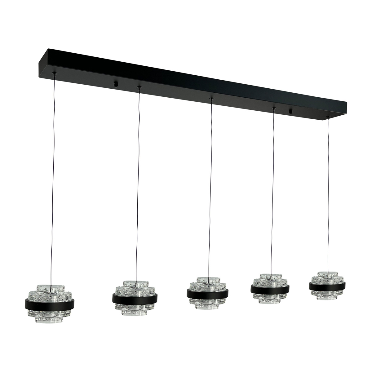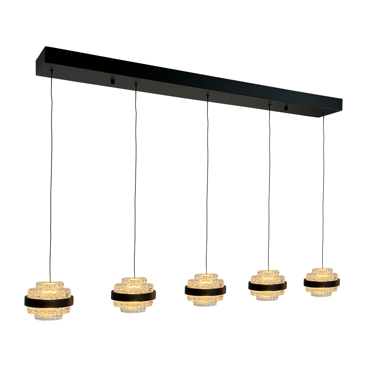 Mooie 5lichts hanglamp uit de Dynasty serie van Highlight. Deze hanglamp heeft een unieke uitstraling door de combinatie van schitterend helder acrylglas met een speelse sprankeling erin verwerkt. De zwarte ring en ophanging geven de hanglamp een mooie en moderne uitstraling.