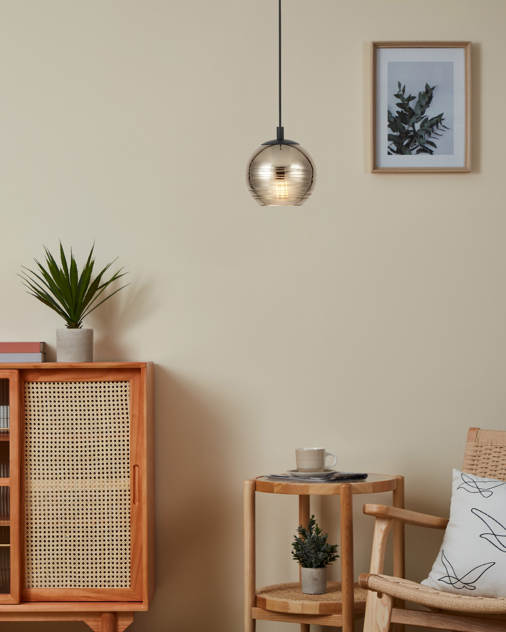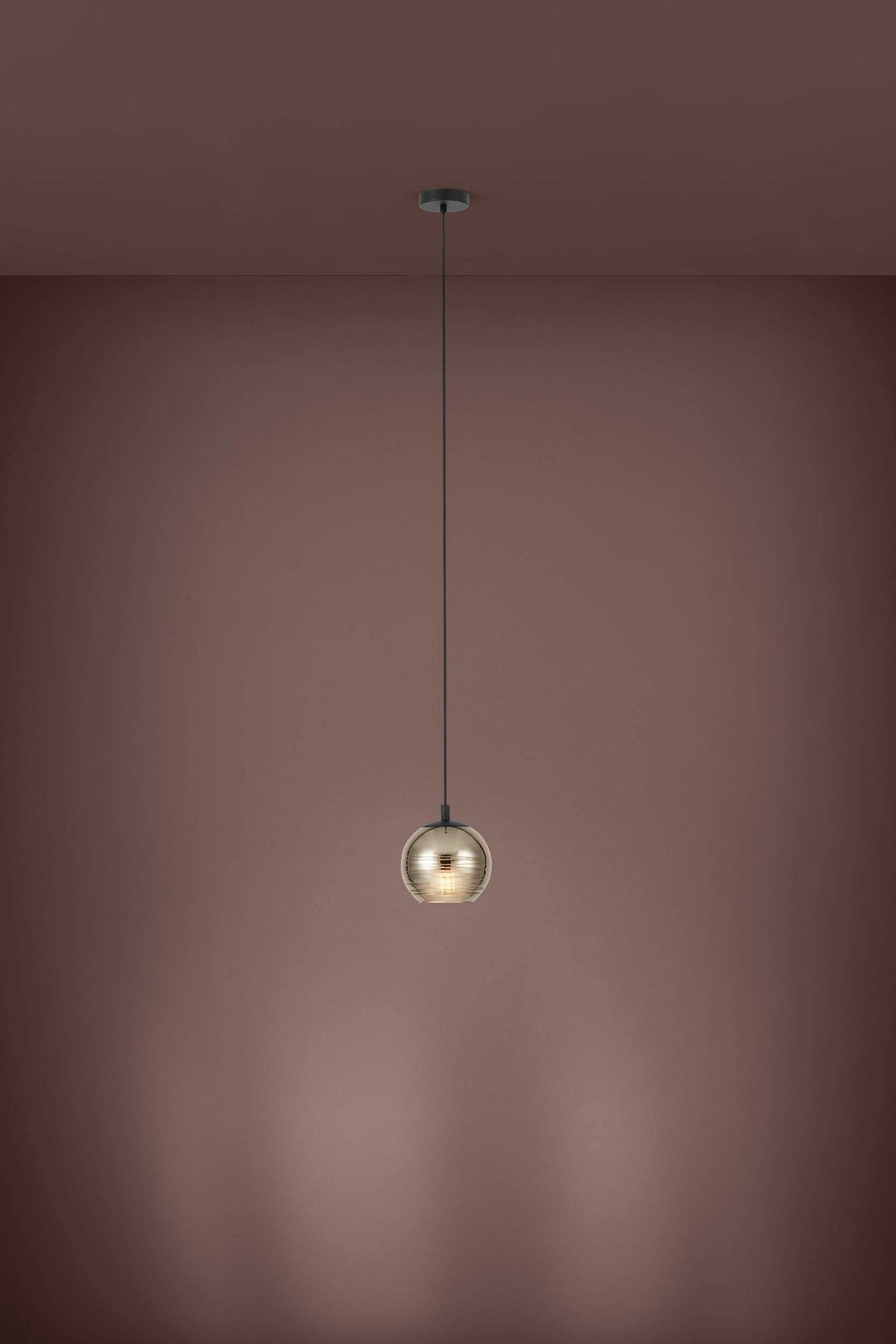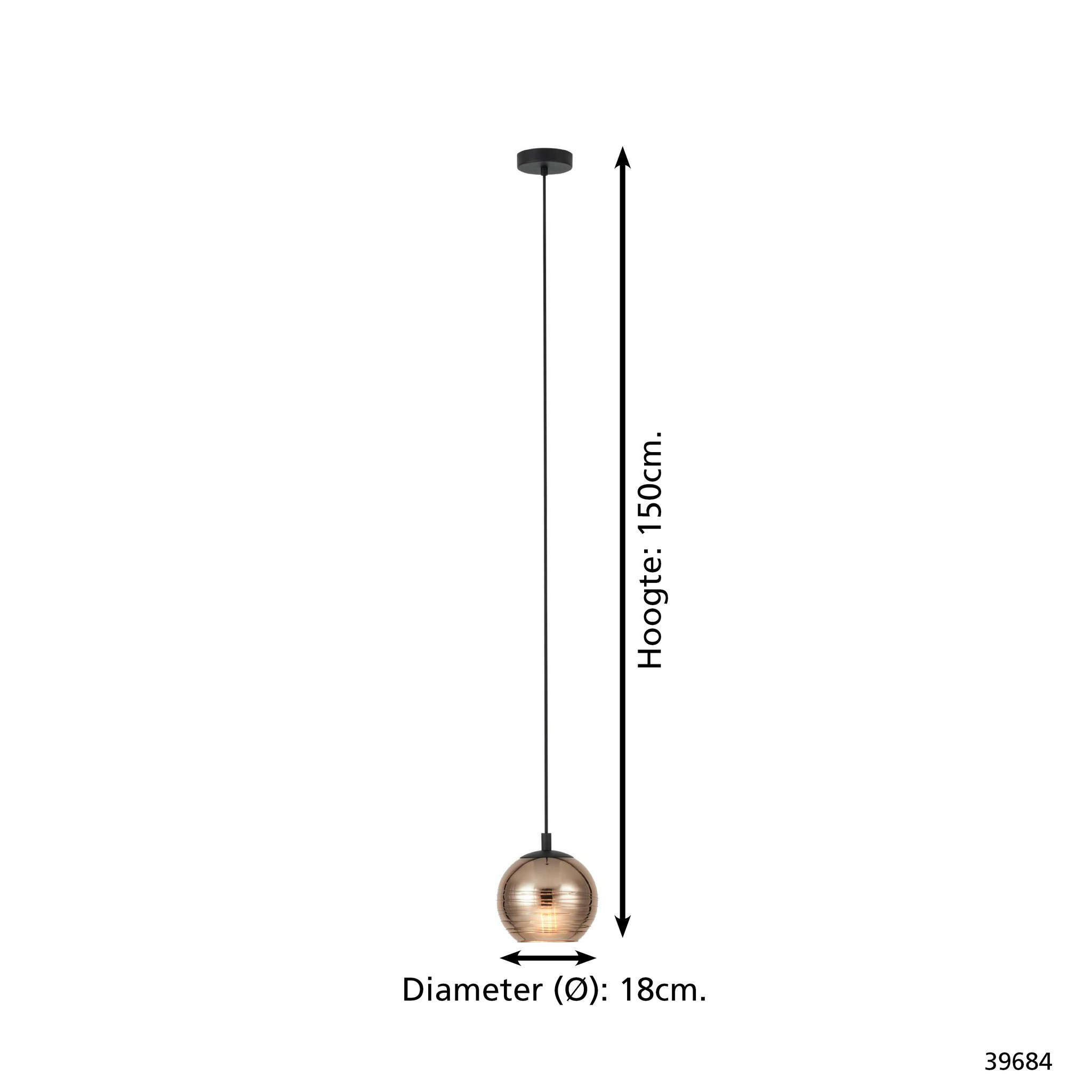 De hanglamp is van metaal en uitgevoerd in het zwart met een goudkleurige glas. De hanglamp heeft een hoogte van maximaal 150cm en een diameter van 18cm.
