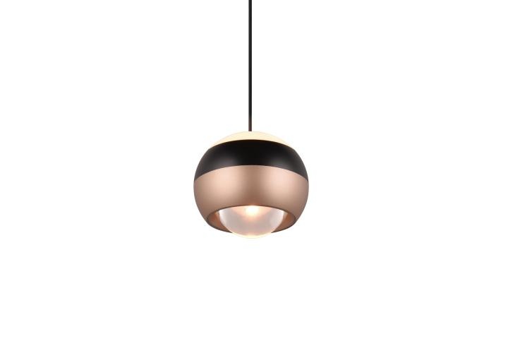De TRIO Select hanglamp Orbit is een zeer stijlvolle hanglamp. De hanglamp bestaat uit één hangende lichtbol. De lichtbol heeft een witte kunststof bovenkant, daaronder een zwarte metalen rand en een bronskleurige open onderzijde.