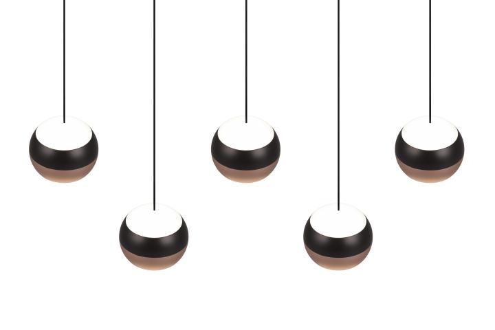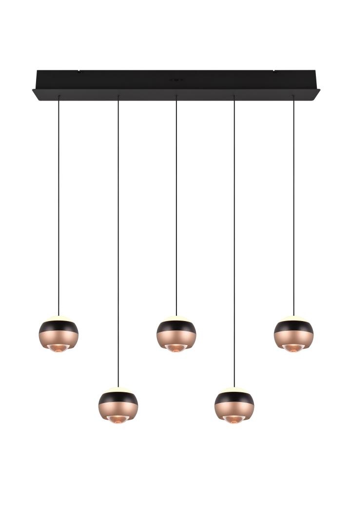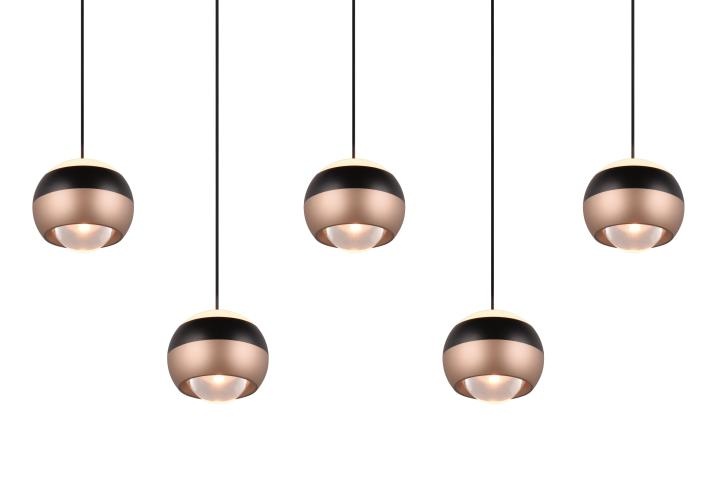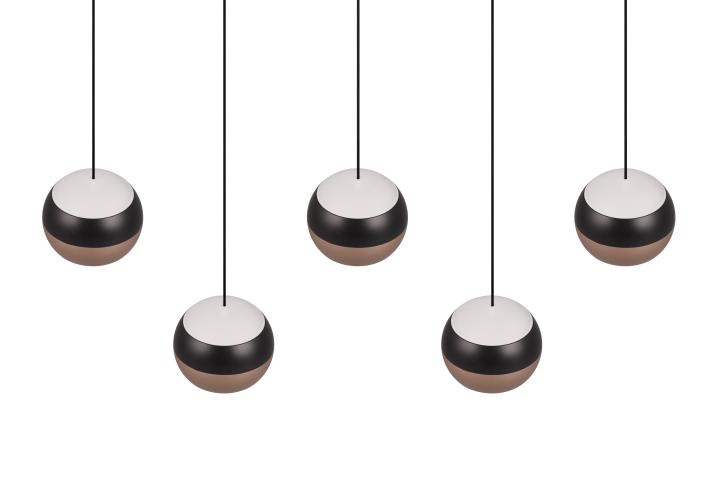 De TRIO Select hanglamp Orbit is een zeer stijlvolle hanglamp. De hanglamp bestaat uit 5 hangende lichtbollen. De lichtbollen hebben een witte kunststof bovenkant, daaronder een zwarte metalen rand en een bronskleurige open onderzijde.