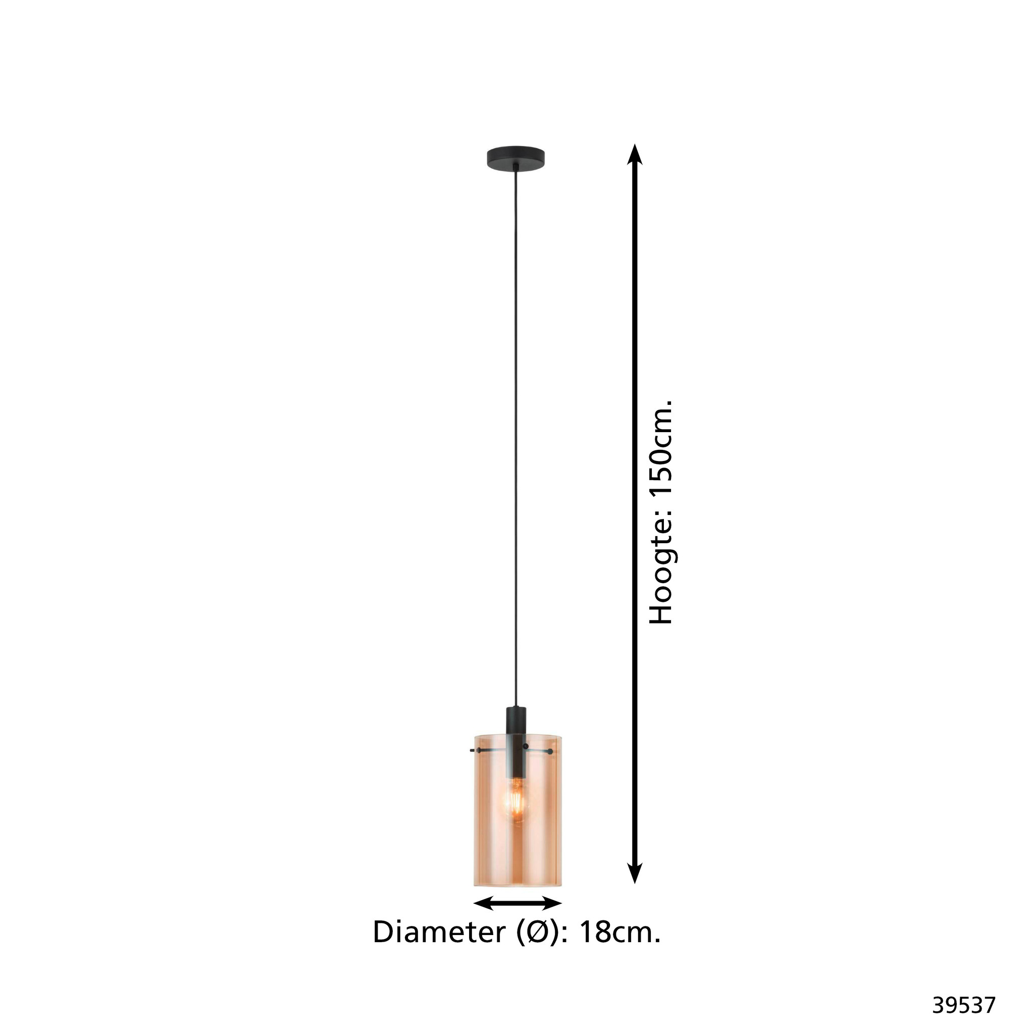 De 1-lichts hanglamp Polverara van Eglo heeft amberkleurig glas. Het amberkleurige glas geeft de lamp een chique en warme look. Het glas heeft een diameter van 18 cm en de lamp heeft een maximale hoogte van 150 cm. Het is mogelijk om de lamp in te korten. De lamp heeft een E27-fitting en wordt geleverd exclusief lichtbron.