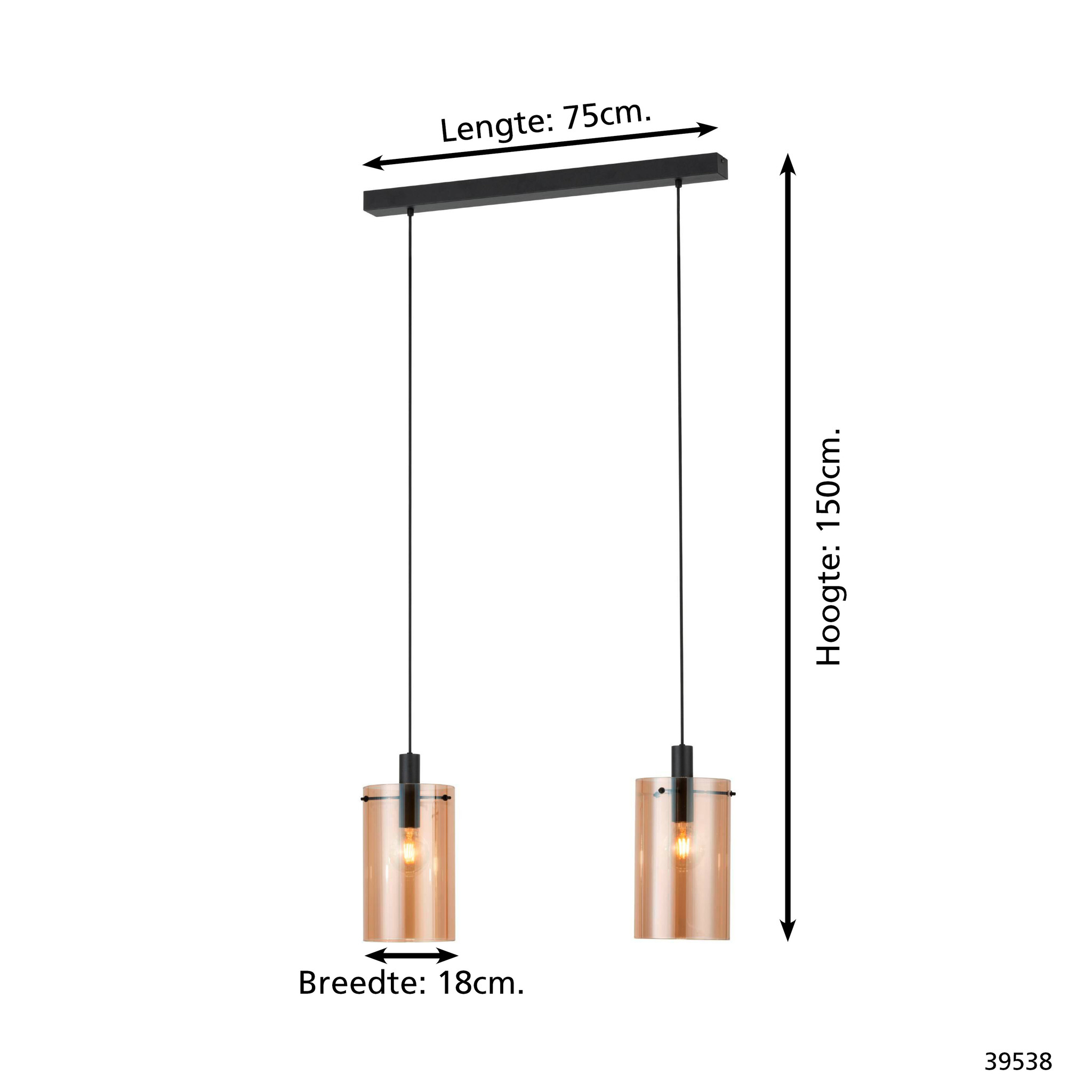De 2-lichts hanglamp Polverara van Eglo heeft amberkleurig glas. Het amberkleurige glas geeft de lamp een chique en warme look. De glazen hebben een diameter van 18 cm. De hanglamp heeft een lengte van 75 cm en de lamp heeft een maximale hoogte van 150 cm. Het is mogelijk om de lamp in te korten. De lamp biedt ruimte aan twee E27-lichtbronnen, deze zijn exclusief, maar kunt u eenvoudig erbij bestellen.
