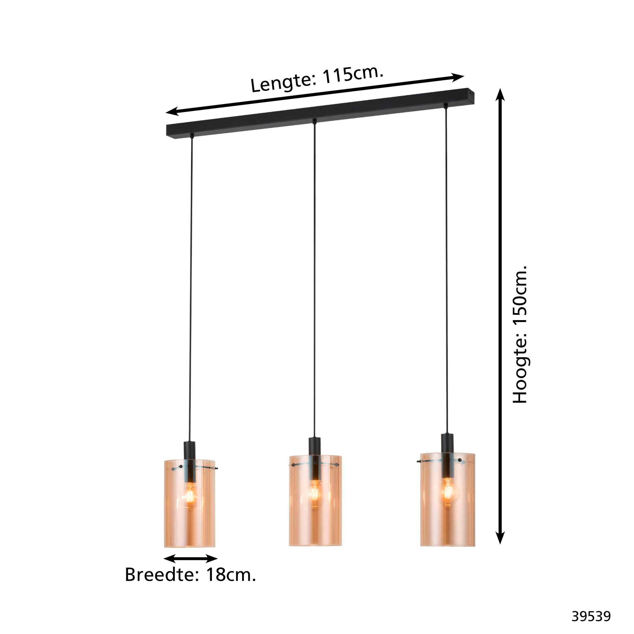 De 3-lichts hanglamp Polverara van Eglo heeft amberkleurig glas. Het amberkleurige glas geeft de lamp een chique en warme look. De glazen hebben een diameter van 18 cm. De hanglamp heeft een lengte van 115 cm en de lamp heeft een maximale hoogte van 150 cm. Het is mogelijk om de lamp in te korten. De lamp biedt ruimte aan drie E27-lichtbronnen, deze zijn exclusief, maar kunt u eenvoudig erbij bestellen.