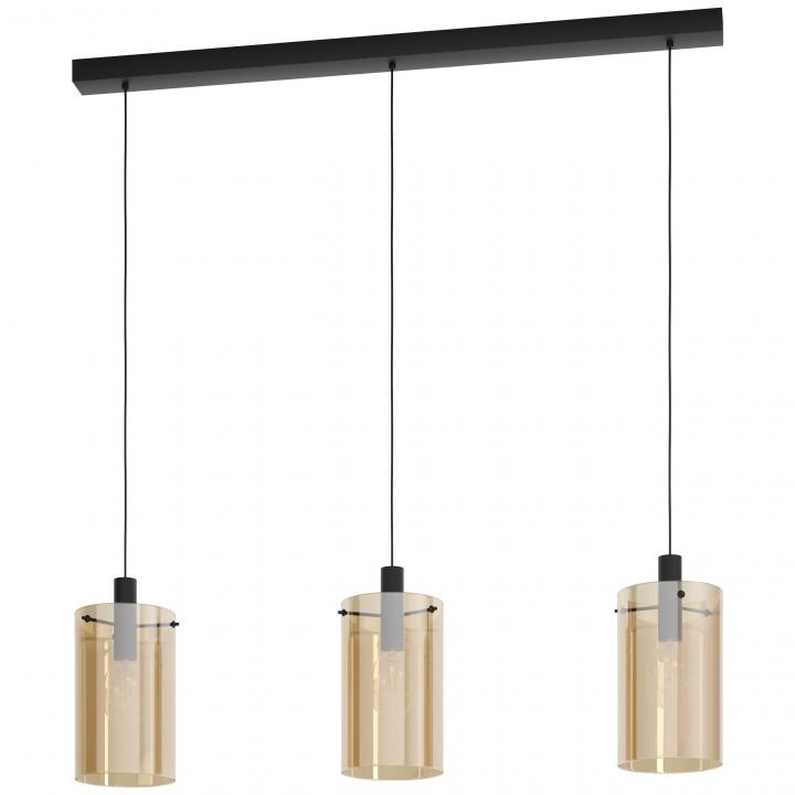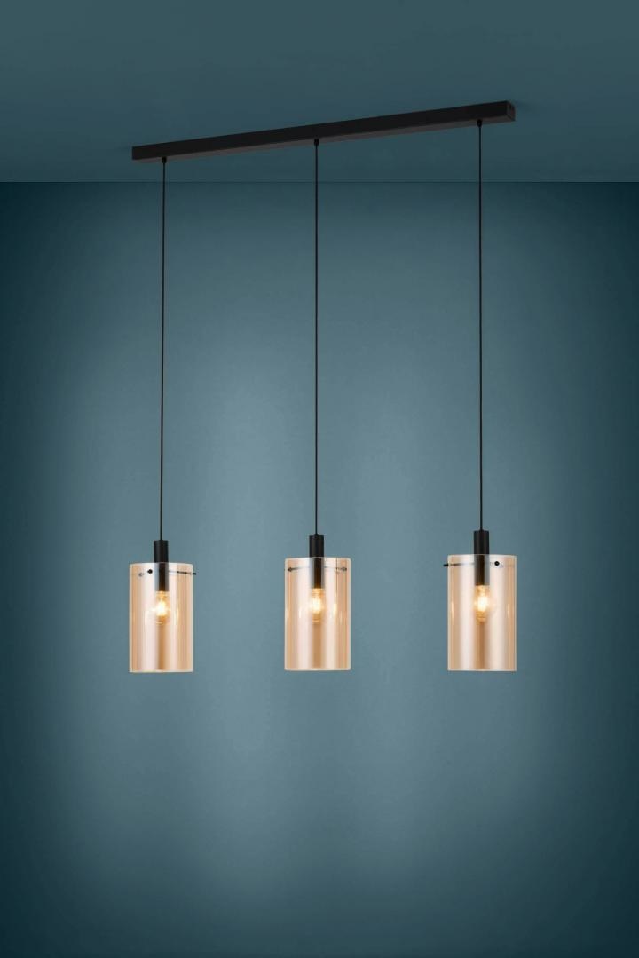 De 3-lichts hanglamp Polverara van Eglo heeft amberkleurig glas. Het amberkleurige glas geeft de lamp een chique en warme look.