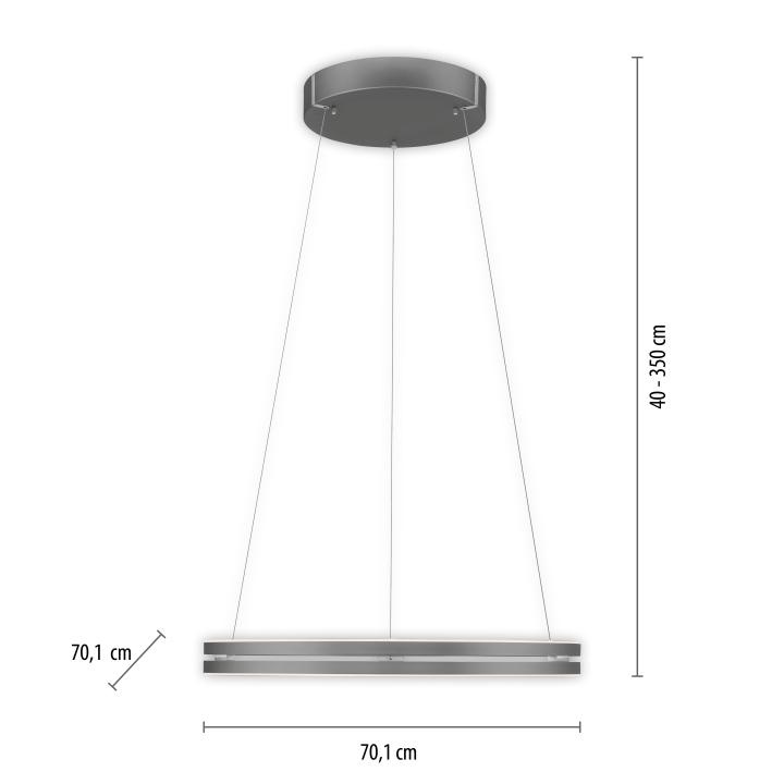 De hanglamp is in hoogte verstelbaar met de meegeleverde afstandsbediening van minimaal 40 cm tot maximaal 350 cm hoogte. De diameter van de lamp is 70 cm.. Deze hanglamp beschikt over 2 x een LED module van 22Watt en 2400Lumen en een instelbare lichtkleur van 2700 tot 5000 Kelvin. De lamp is gemaakt van aluminium en uitgevoerd in het grijs. De lamp is dimbaar middels de meegeleverde afstandsbediening. Deze lamp kan niet gecombineerd worden met een externe dimmer.