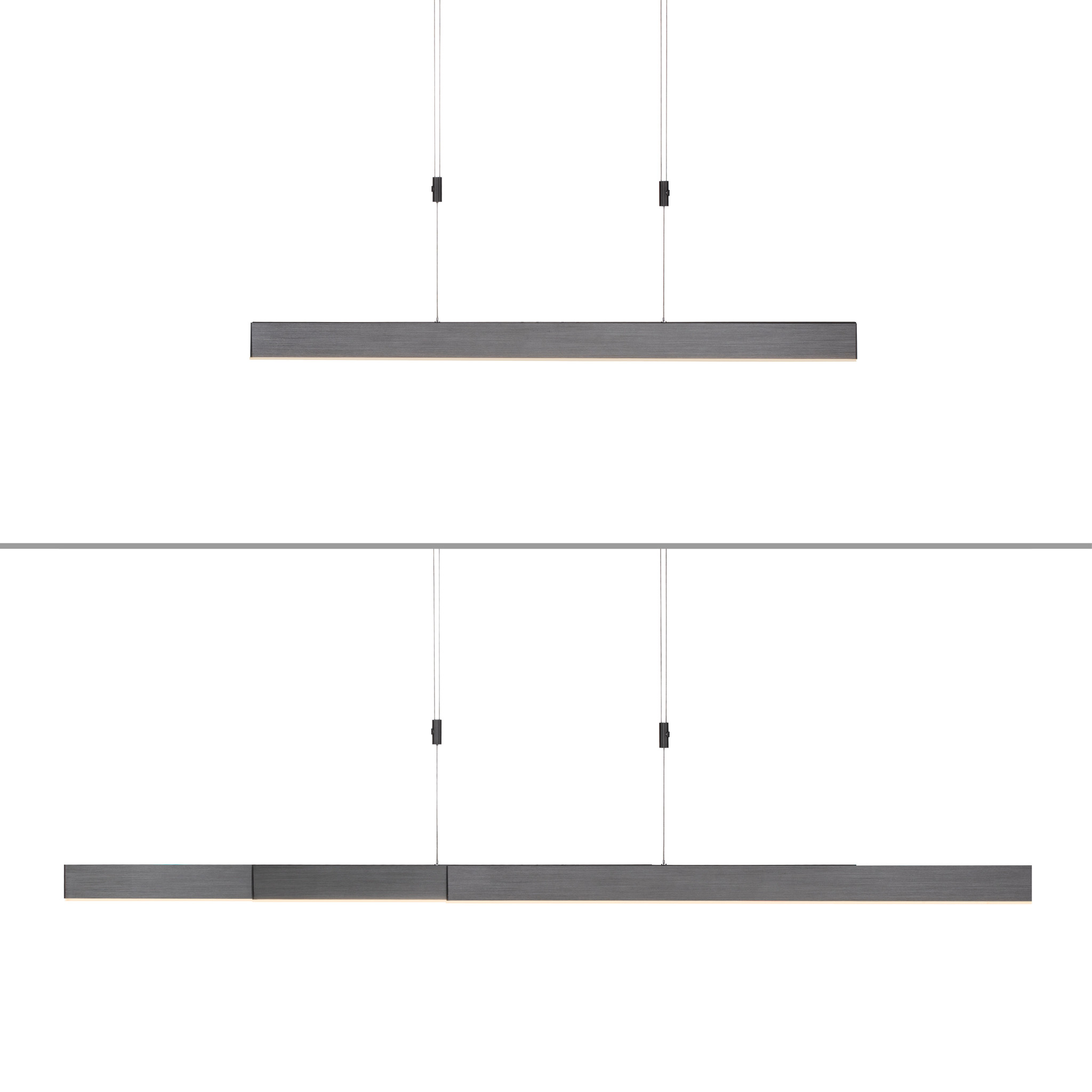 De Pure-Moto heeft een uitschuifbare lengte van 120 tot 200 cm, breedte van 5,5 cm een verstelbare hoogte tot maximum 200 cm. De hanglamp is uitgevoerd in metaal en afgewerkt in de kleur grijs, ook verkrijgbaar in de kleuren messing of aluminium. De lamp heeft 3 geïntegreerde LED lichtbronnen van 13 Watt en straalt 1900Lm uit van warmwitlicht (2700K) tot daglichtwit (5000K), ook dit kan gedimd worden met de afstandsbediening of via de sensortoetsen op het aanraakvlak van de lamp ingesteld worden en dankzij de geheugenfunctie blijft de laatst geselecteerde instellingen bewaard.
