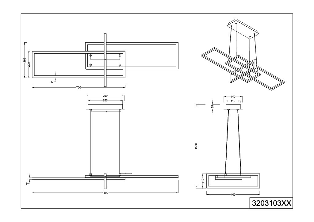 De lamp heeft een breedte van 110 cm en een diepte van 40 cm. De lamp is in hoogte verstelbaar tot maximaal 150 cm hoog. De afmetingen van de plafondbevestiging zijn De lamp heeft een geïntegreerde LED-lichtbron van 34 Watt, 3000 Kelvin en 4200 Lumen.