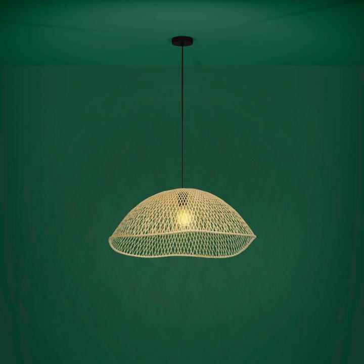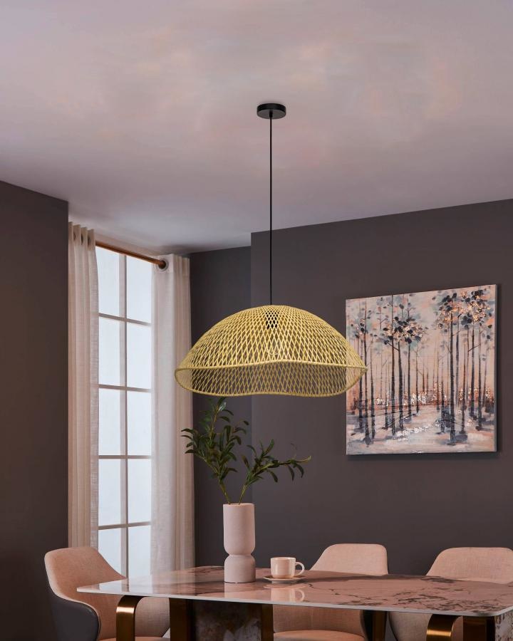 De hanglamp uit de Sambucona serie van Eglo past perfect in een huis met Scandinavisch interieur. De hanglamp heeft een groot, spreidend lampenlap met een opengewerkte structuur van dunne houten elementen in een rustieke stijl.