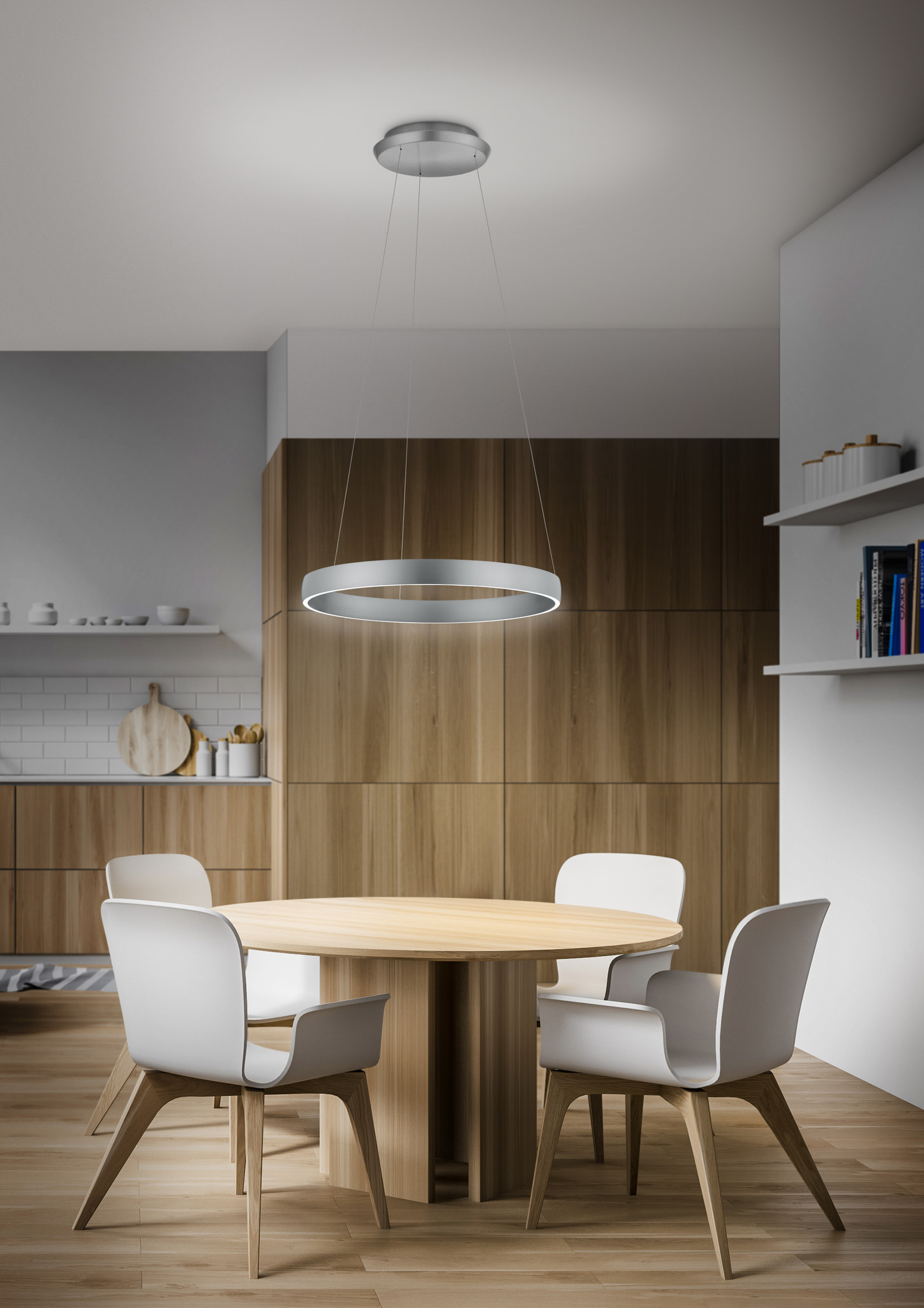 De hanglamp heeft twee geïntegreerde energiezuinige LED lichtbronnen met een totaal wattage vermogen van 72 Watt en straalt een aangename warmwitlicht (2200K) tot aan helder witlicht (3000K) uit met een lichtopbrengst van 7850 Lm aan het plafond en in de ruimte. De hanglamp heeft een diameter van 60 cm en een verstelbare hoogte van 70 cm tot een maximale hoogte van 170 cm. De plafondbevestiging is 6 cm hoog, met een diameter van 30 cm en heeft een strakke uitstraling met behulp van de magnetische bevestiging in de plafondplaat zodat er geen schroeven zichtbaar zijn. Het ronde frame van de lamp is 1,1 cm dik bij 5,5 cm hoog.