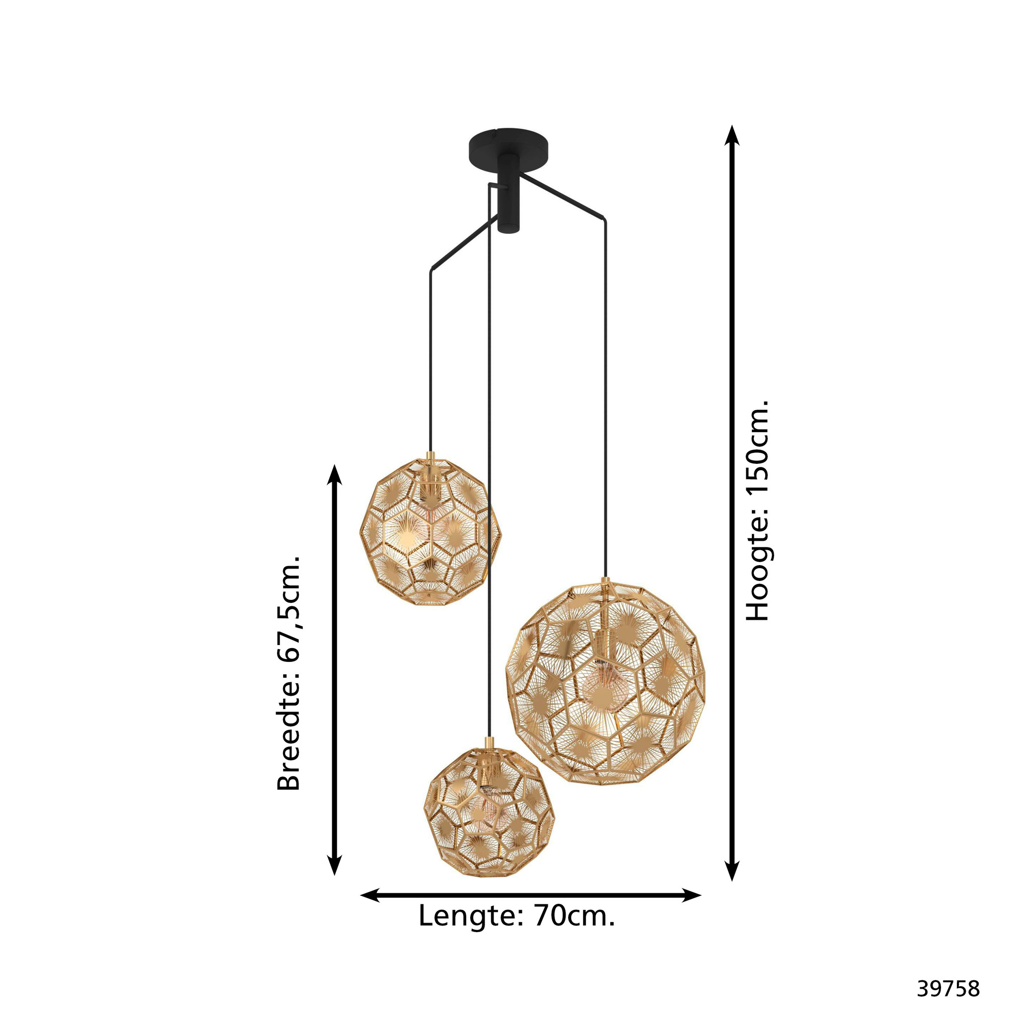 De hanglamp is van metaal en uitgevoerd in het zwart met 3 goudkleurige bollen. De hanglamp heeft een hoogte van maximaal 150cm en is 70cm lang en 67,5cm breed.