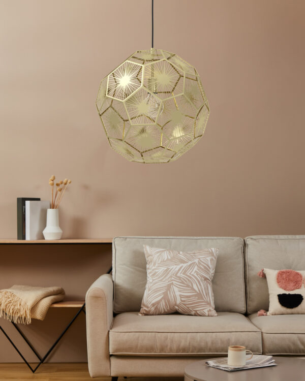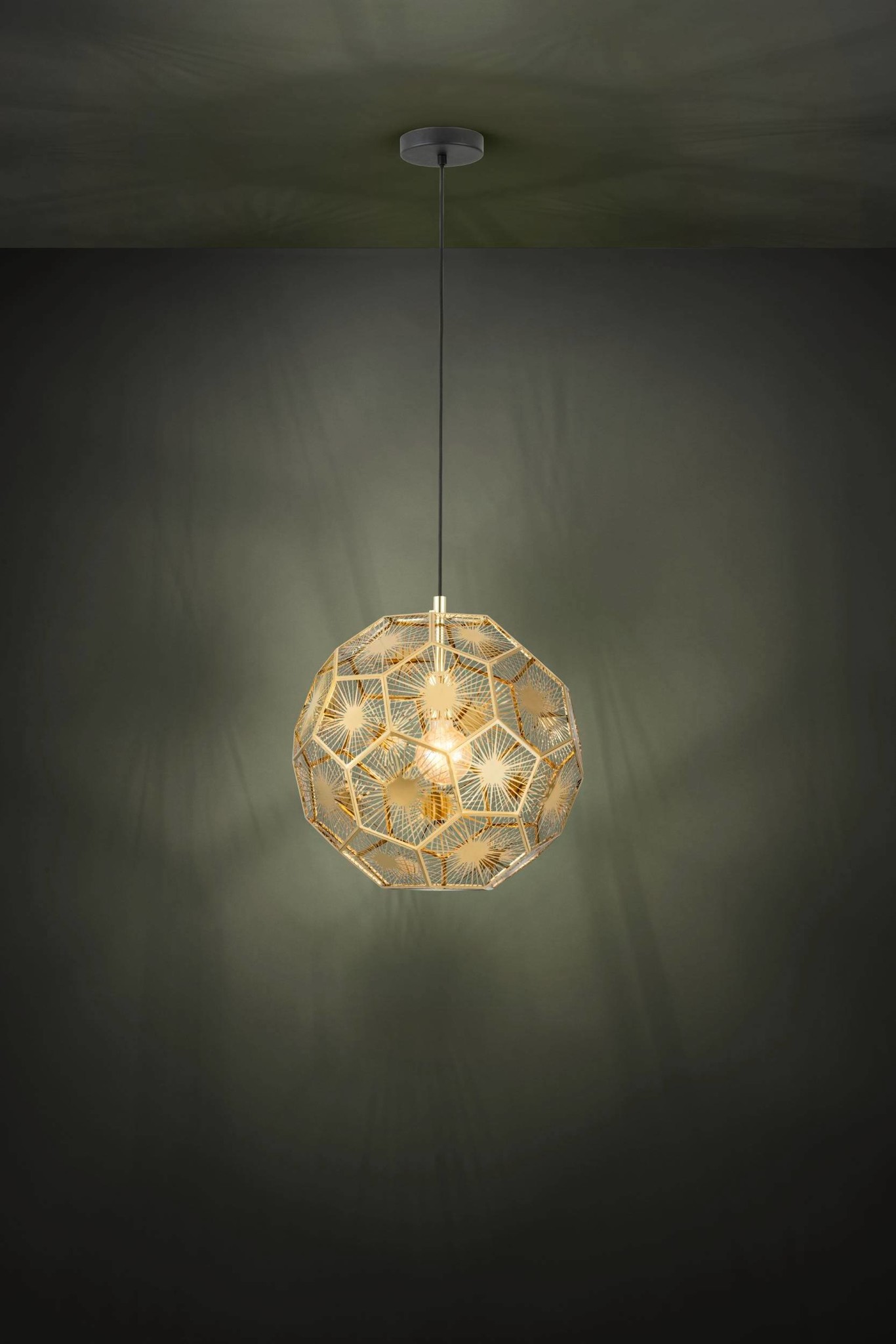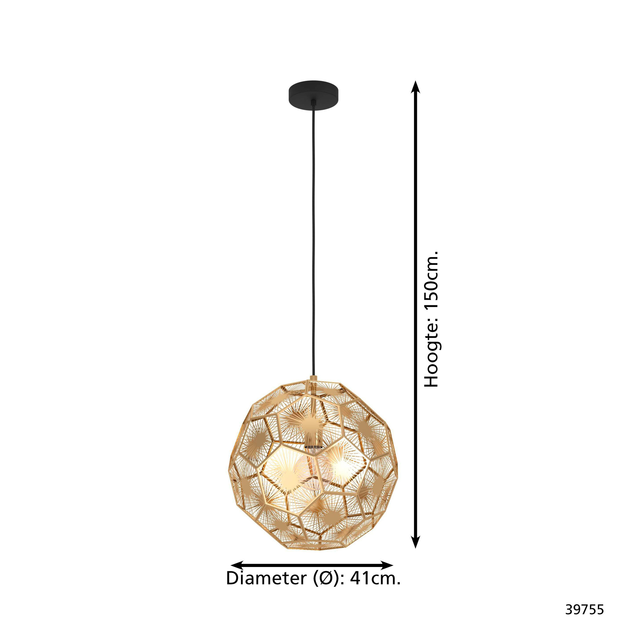 De hanglamp is van metaal en uitgevoerd in het zwart met een goudkleurige bol. De hanglamp heeft een hoogte van maximaal 150 cm en een diameter van 41 cm.