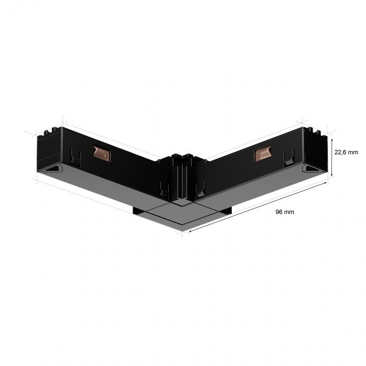 De Hue Perifo external corner connector in de kleur zwart, hiermee worden hoeken van 90 graden voor de railverlichting in een L-vorm of U-vorm gecreëerd. Bij de Perifo external corner connector ligt de positieve draad aan de buitenkant.
