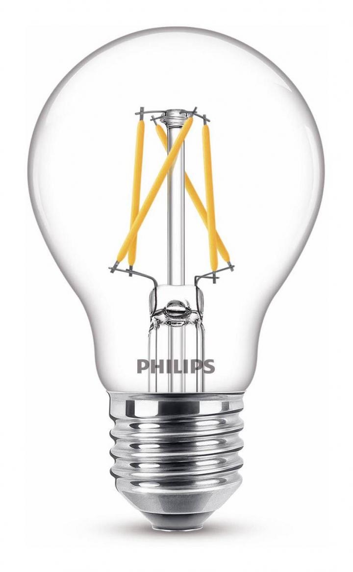 LED filament met peervorm van Philips (LED Classic, lichtkleur variabel, niet dimbaar) met een E27 fitting. Deze lichtbron is voorzien van 3 standen. Wissel de SceneSwitch LED lamp tussen helder licht (100%), natuurlijk licht (40%) en zacht, warm licht (10%).