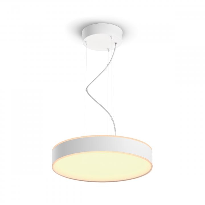 Deze hanglamp Enrave komt uit de White Ambiance serie van Philips Hue. Het is een moderne hanglamp met een ronde vorm. De lamp geeft een mooi lichteffect, doordat de lamp aan de onderkant en bovenkant licht geeft. Aan de bovenkant heeft de lamp twee ringen die licht geven als de lamp aan staat. Zowel de onder-, boven- als zijkant mag dus gezien worden. De lamp heeft een diameter van 42,5 cm en heeft een maximale hoogte van 160 cm. De lamp is in hoogte te verstellen. De hanglamp is gemaakt van metaal in combinatie met kunststof en is afgewerkt in een witte kleur. De lamp heeft een geïntegreerde LED-lichtbron en wordt geleverd inclusief Hue Dimmer Switch, waarmee u de lamp op afstand kunt schakelen, dimmen en een lichtscène kunt kiezen.