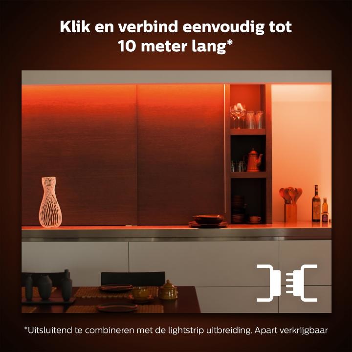 De lichtstrip Plus van Philips Hue. Met de lichtstrip geeft u met een minimalistische uitstraling, uitgebreide mogelijkheden toch zoveel meer sfeer aan uw thuis. Deze basis set bestaat uit een lichtstrip van 2 meter en een voeding.