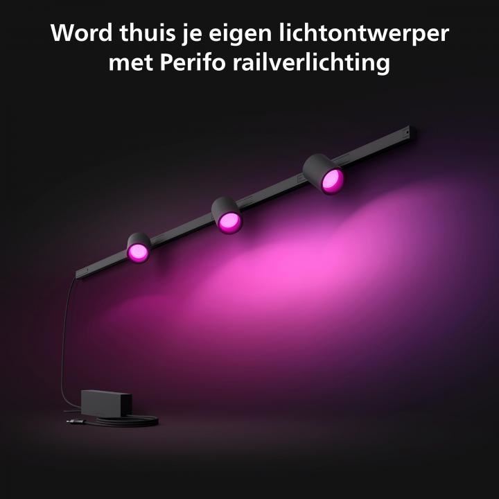 Hue Perifo, het railsysteem met de de geïntegreerde Hue technologie. Nu verkrijgbaar bij Van den Heuvel Verlichting voor het beste Hue advies.