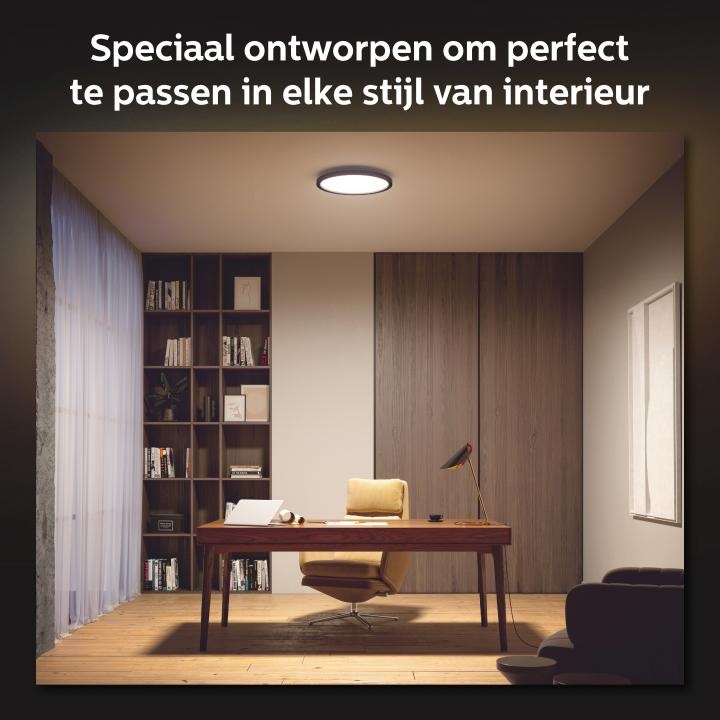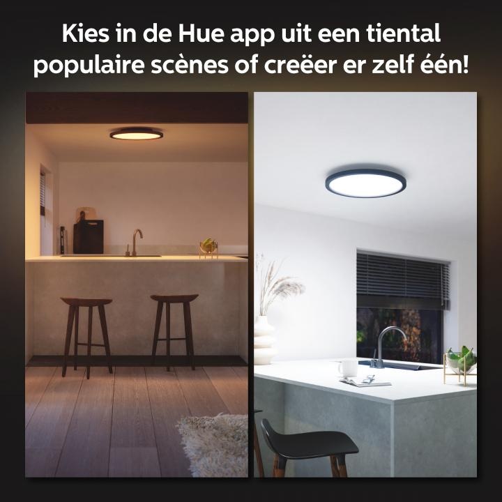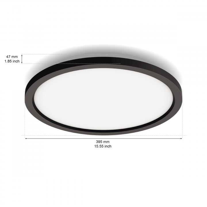 Deze ultraslanke plafondlamp met ongekende mogelijkheden past perfect in jouw interieur. Ultieme slimme verlichting met de ronde Philips Hue White ambiance Aurelle paneellamp geniet je van warm- tot koelwit licht met vier voorgeprogrammeerde licht scènes. Vind je dat niet genoeg? Voeg er dan een Hue Bridge (afzonderlijk verkrijgbaar) aan toe, dan krijg je toegang tot alle slimme lichtfuncties. Je kunt de Aurelle paneellamp draadloos bedienen met de meegeleverde Hue Dimmer switch of via de Hue app, ook als je niet thuis bent. De lamp heeft een diameter van 39,5 cm en een hoogte van 4,7 cm. De plafondlamp met een IP20 waarde is gemaakt van aluminium in combinatie met kunststof en is afgewerkt in een zwarte kleur.