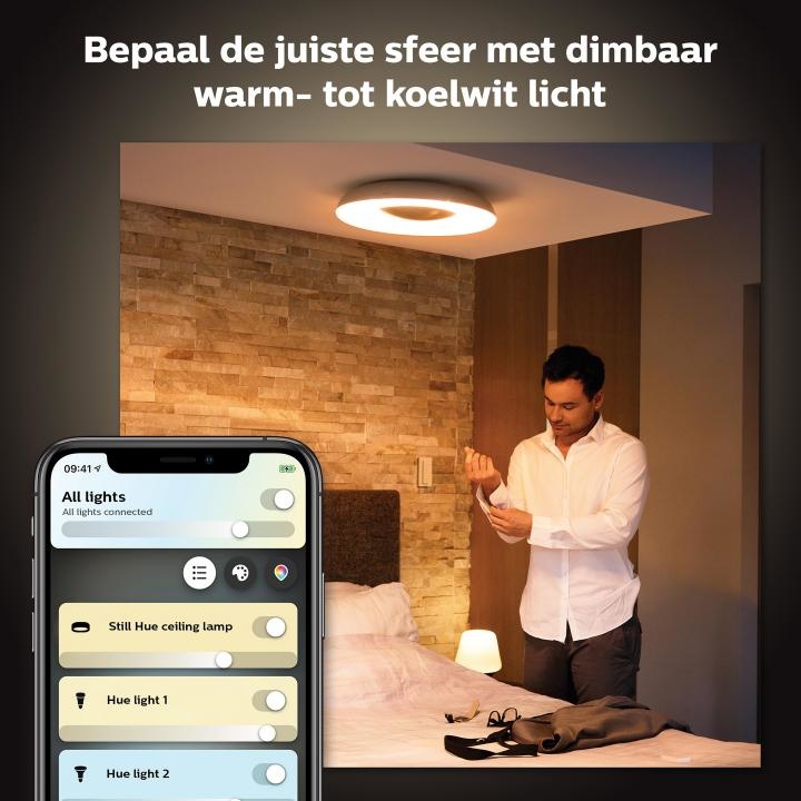 Deze plafondlamp Still komt uit de White Ambiance serie van Philips Hue. Het is een lamp met een moderne uitstraling. Wordt geleverd inclusief Hue Dimmer Switch.