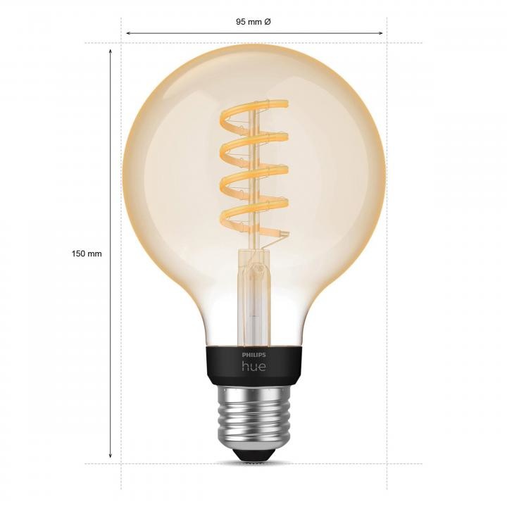 De combinatie van het amberkleurige glas en het zichtbare filament maakt dat deze lamp gezien mag worden. Deze lichtbron komt dan ook goed tot zijn recht in een open armatuur. De lamp kan bediend worden via Bluetooth of u kunt de lamp verbinden met uw Hue Bridge voor extra mogelijkheden. Met de Philips Hue app kunt u de lamp schakelen, dimmen en de lichtkleur aanpassen. De lichtbron heeft een wattage van 7 W. De lichtopbrengst is 550 Lumen en de kleurtemperatuur is in te stellen van 2200 tot 4500 Kelvin. De afmetingen van de lichtbron zijn 150 x 95 mm.