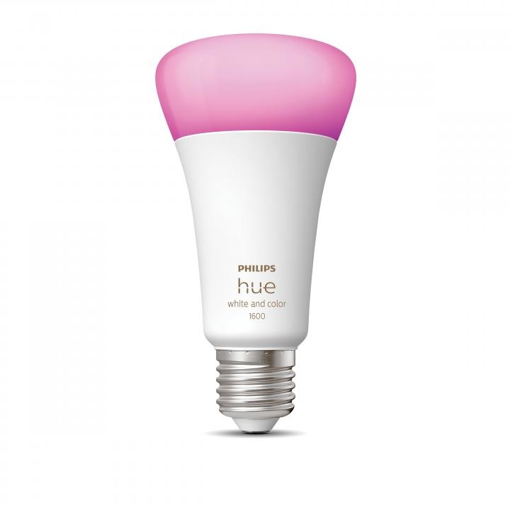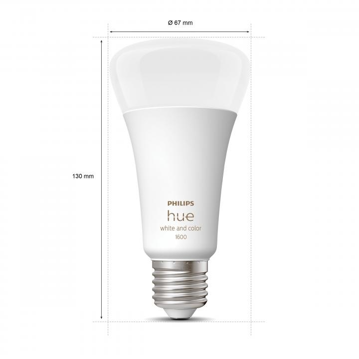 Deze lamp kan bediend worden via Bluetooth of u kunt de lamp verbinden met uw Hue Bridge voor extra mogelijkheden. Met de Philips Hue app kunt u de lamp schakelen, dimmen en de lichtkleur aanpassen. Ook is het mogelijk om de lamp te bedienen met uw stem als u de lamp aansluit op een slimme spraakassistent. De lichtbron heeft een wattage van 13,5 W. De lichtopbrengst is 1600 Lumen en de kleurtemperatuur is in te stellen van 2000 tot 6500 Kelvin. De lichtbron heeft een A67-formaat (67 x 130 mm).