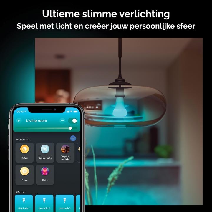 Deze lichtbron van Philips Hue heeft een E27-fitting en komt uit de White and Color Ambiance serie. Met deze lichtbron kunt u kiezen uit 16 miljoen kleuren en 50.000 wittinten. Zo creëert u voor ieder moment de juiste sfeer. Pas de kleur aan aan uw gemoedstoestand. Een romantisch filmavondje met uw partner? Kies voor een warme roze tint. Gaat u iets doen waarbij concentratie vereist is, zoals studeren? Kies dan voor een koele witte lichtkleur. U kunt zelfs de kleur van het licht synchroniseren met uw muziek en films.