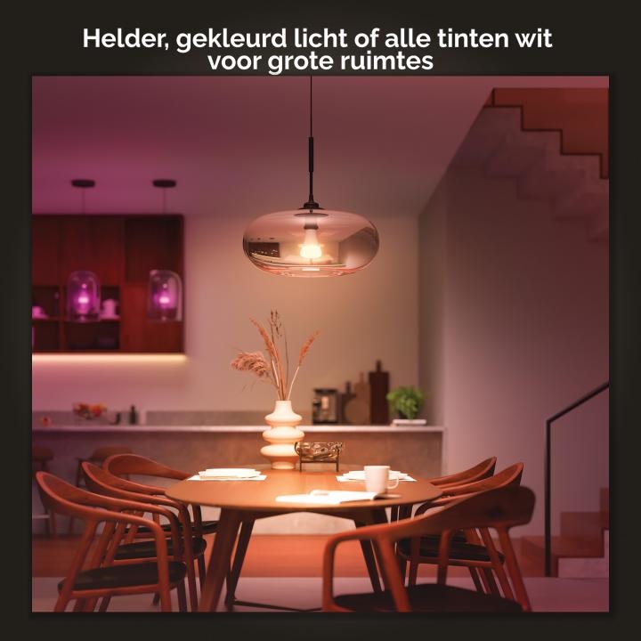 Deze lichtbron van Philips Hue heeft een E27-fitting en komt uit de White and Color Ambiance serie. Met deze lichtbron kunt u kiezen uit 16 miljoen kleuren en 50.000 wittinten. Zo creëert u voor ieder moment de juiste sfeer.