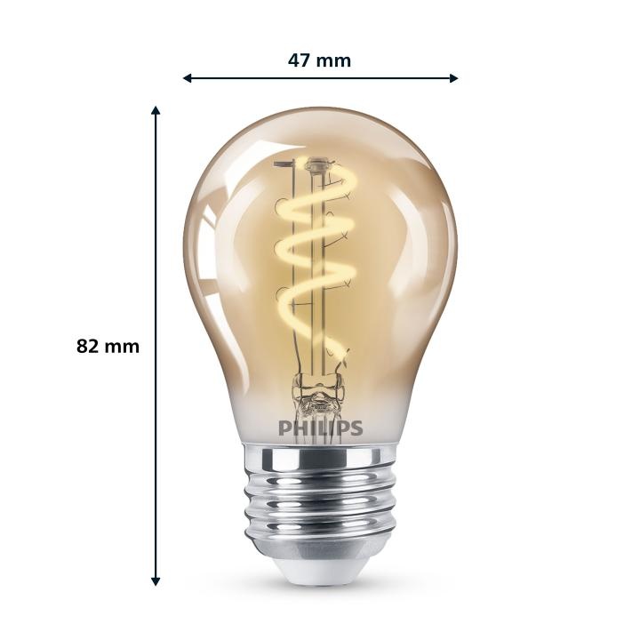 Accentueer uw huis met sfeervol verlichting met deze kogelvormige gouden Philips LED filamentlamp en zorg voor extra sfeer in huis. Deze lichtbron zorgt voor een stijlvol lichtelement en geven sfeervol warmwit licht. De lichtbron heeft een gouden coating en in de lamp zie je een dimbare lichtspiraal, wat doet denken aan een gloeilamp van vroeger. Met EyeComfort, voor licht dat aangenaam is voor uw ogen. De lichtbron heeft een E27-fitting, en past dus in de meeste lampen met grote fitting.