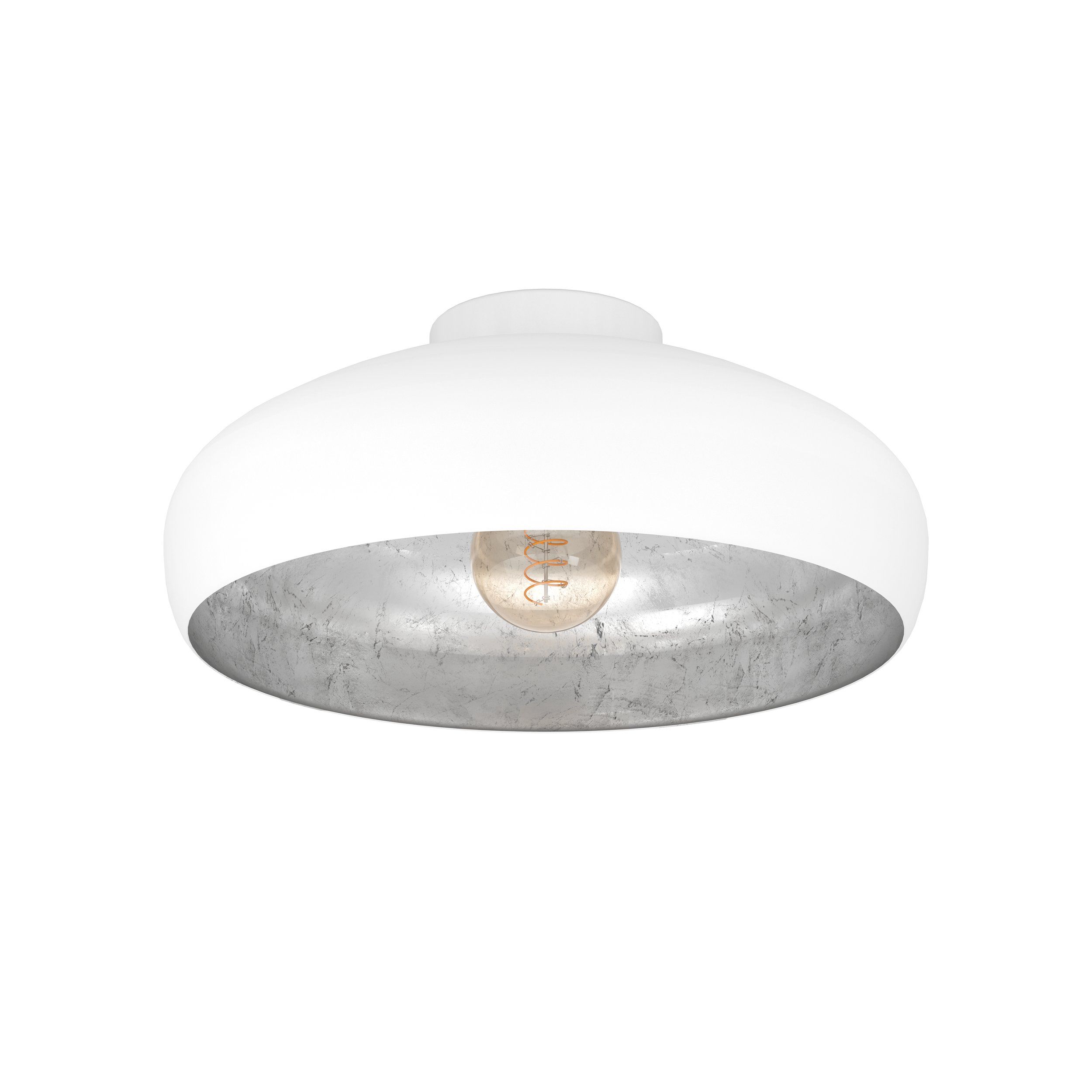 Deze mooie plafondlamp komt uit de Mogano serie van Eglo. De plafondlamp is van staal en uitgevoerd met een witte coating aan de buitenkant en zilver in de binnenkant.
