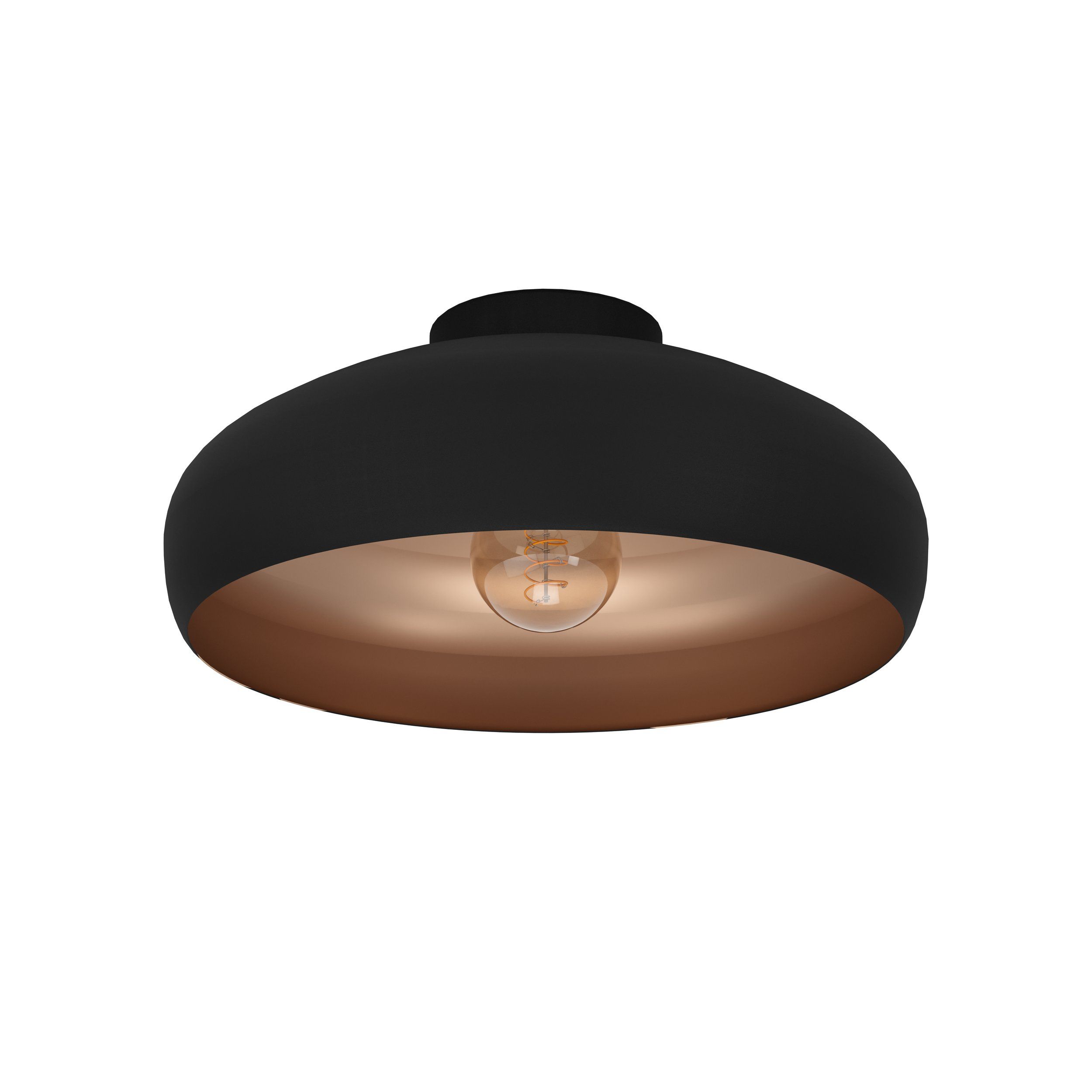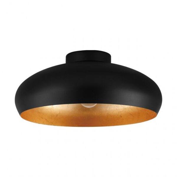 Deze mooie plafondlamp komt uit de Mogano serie van Eglo. De plafondlamp is van staal en uitgevoerd met een zwarte coating aan de buitenkant en koper in de binnenkant.