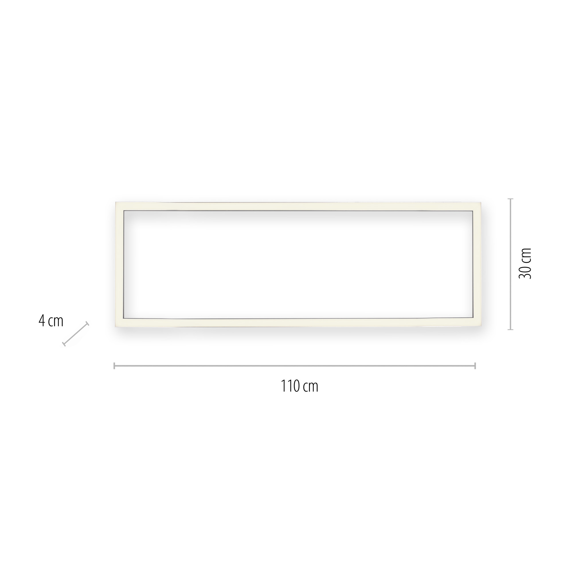 Deze plafondlamp is 110 cm lang en 30 cm breed.
