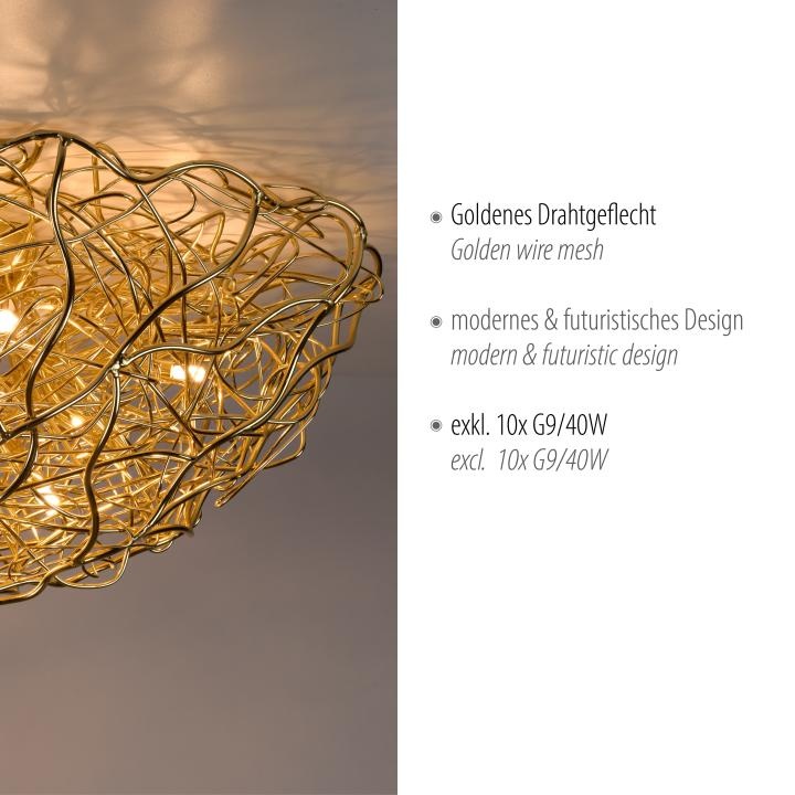 Deze plafondlamp heeft ruimte voor 10 stuks G9 lichtbronnen van maximaal 40 Watt. De lamp is uitgevoerd in geweven metaal draadgaas en afgewerkt in de kleur goud, ook verkrijgbaar in de kleur zilver. De lamp heeft een diameter van 80 cm en komt 30 cm van het plafond af.