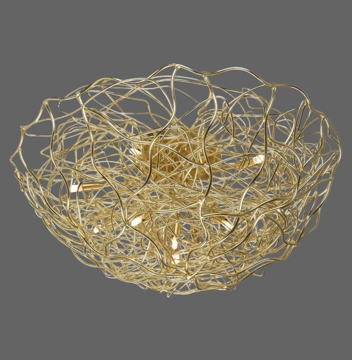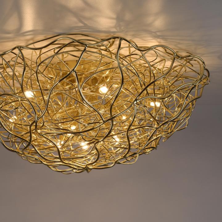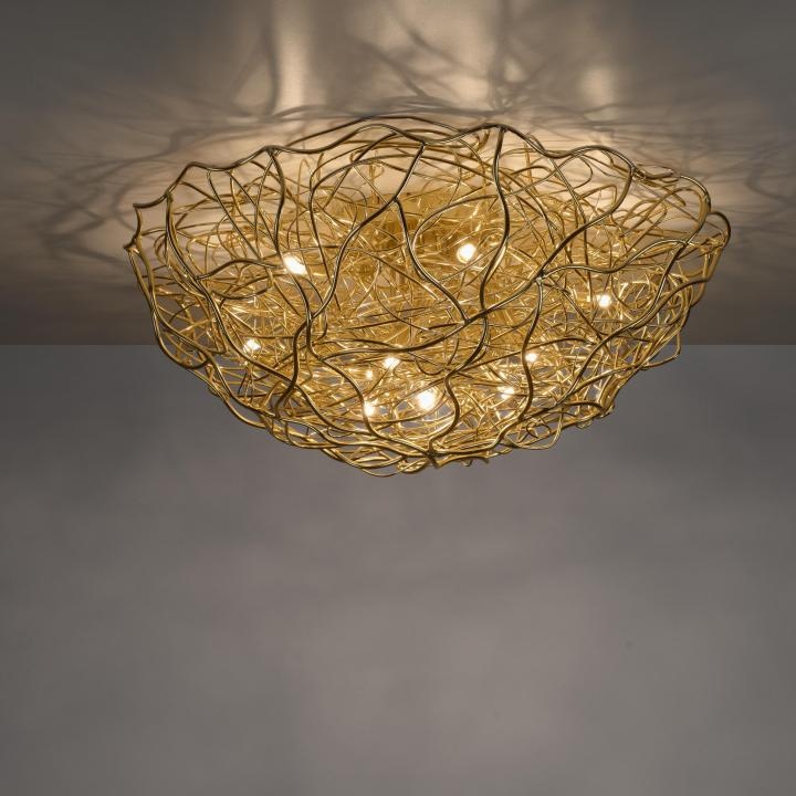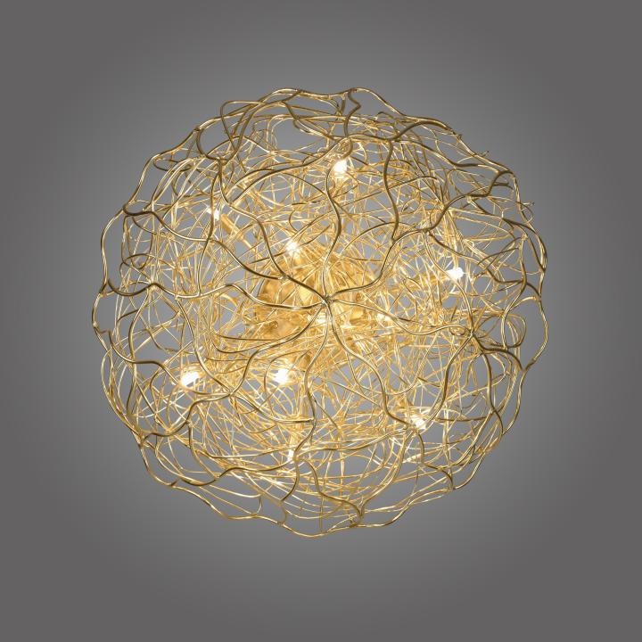 De plafondlamp Sarea is een ware blikvanger en trekt alle aandacht in de ruimte: de plafondlamp is gemaakt van gepoleerd goud staaldraad, met daarin ruimte voor 10 kleine lichtpunten.