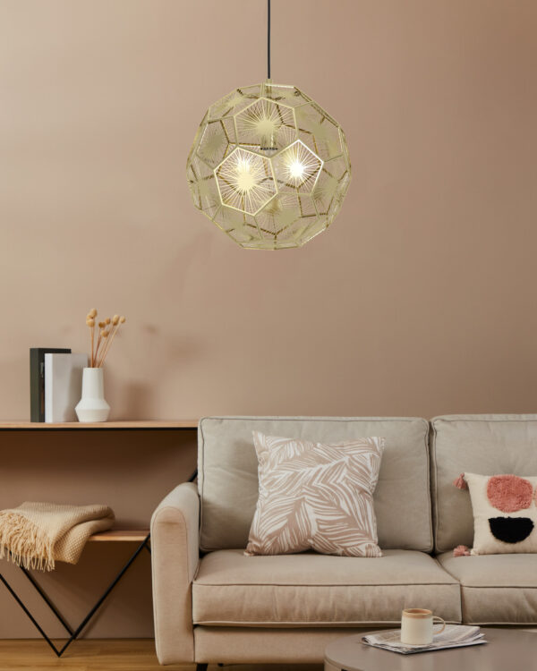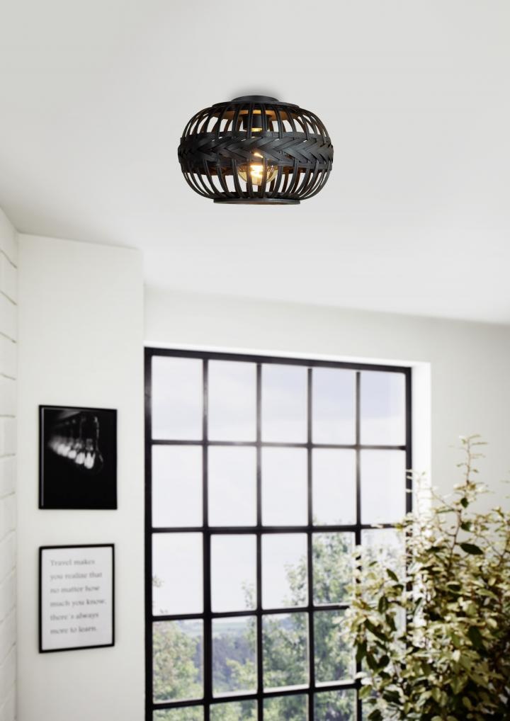 De plafondlamp uit de Towcester serie van Eglo heeft een natuurlijk tintje, de lampenkap in de vorm van een gevlochten mand zorgt ervoor dat het licht op een subtiele manier reflecteert rondom de omgeving van de lamp.