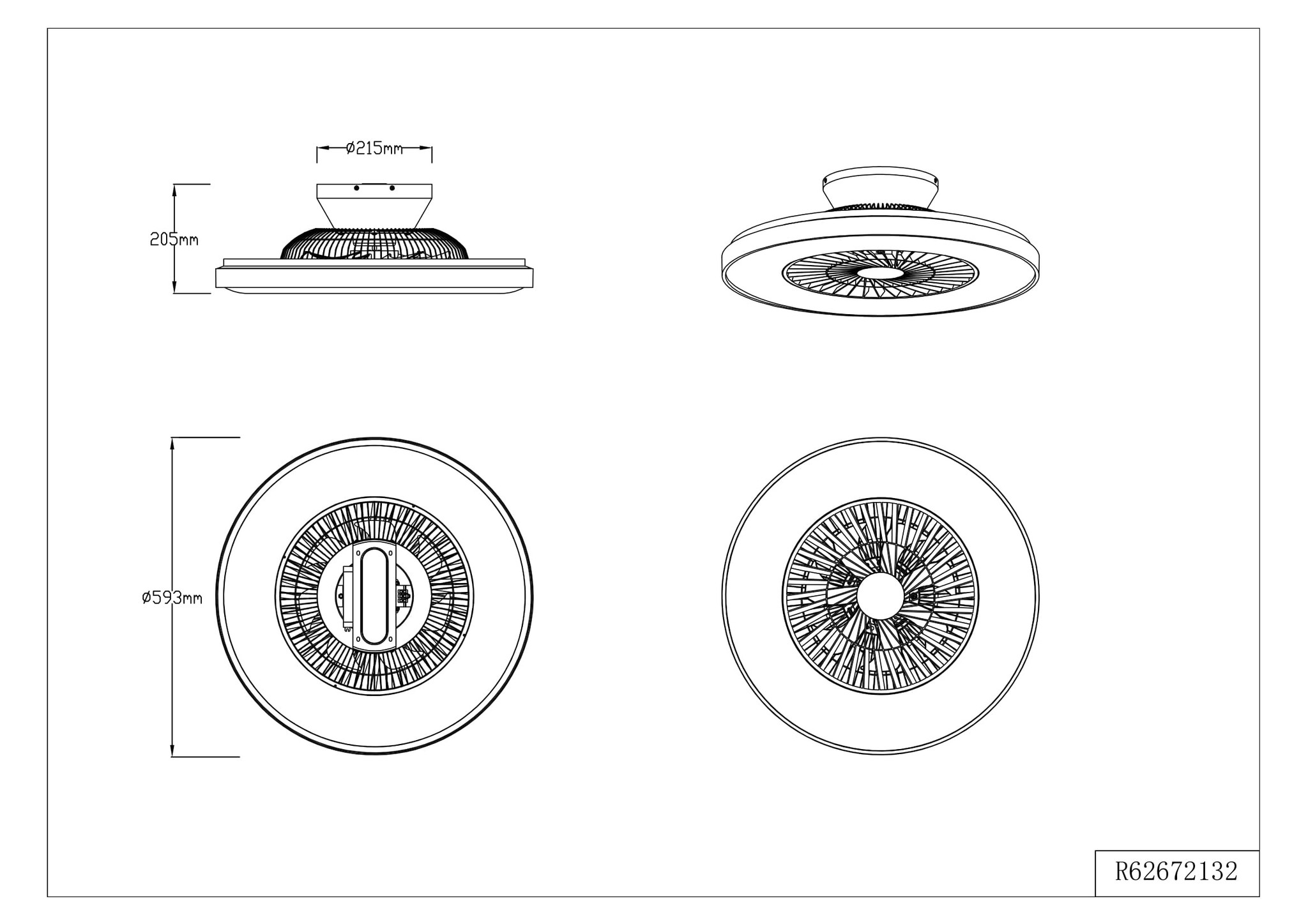 De plafondventilator is gemaakt van kunststof en heeft een diameter van 59.5 cm en is 20.5 cm hoog. De geïntegreerde LED lichtbron heeft een vermogen van 40 Watt, de lichttemperatuur is instelbaar van 3000 tot 6500 Kelvin en heeft een lichtsterkte van 5000 Lumen. De ventilator wordt geleverd met en afstandsbediening.