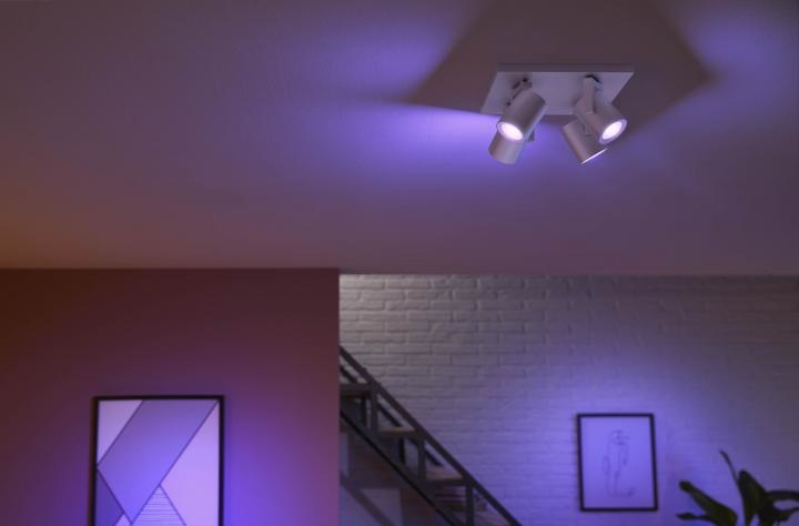 De spot is 24 cm breed en de spot komt 12.6 cm van het plafond af. De Hue White & Color Ambiance lichtbronnen (4×5.7W) kunt u traploos schakelen naar elke gewenste kleur.