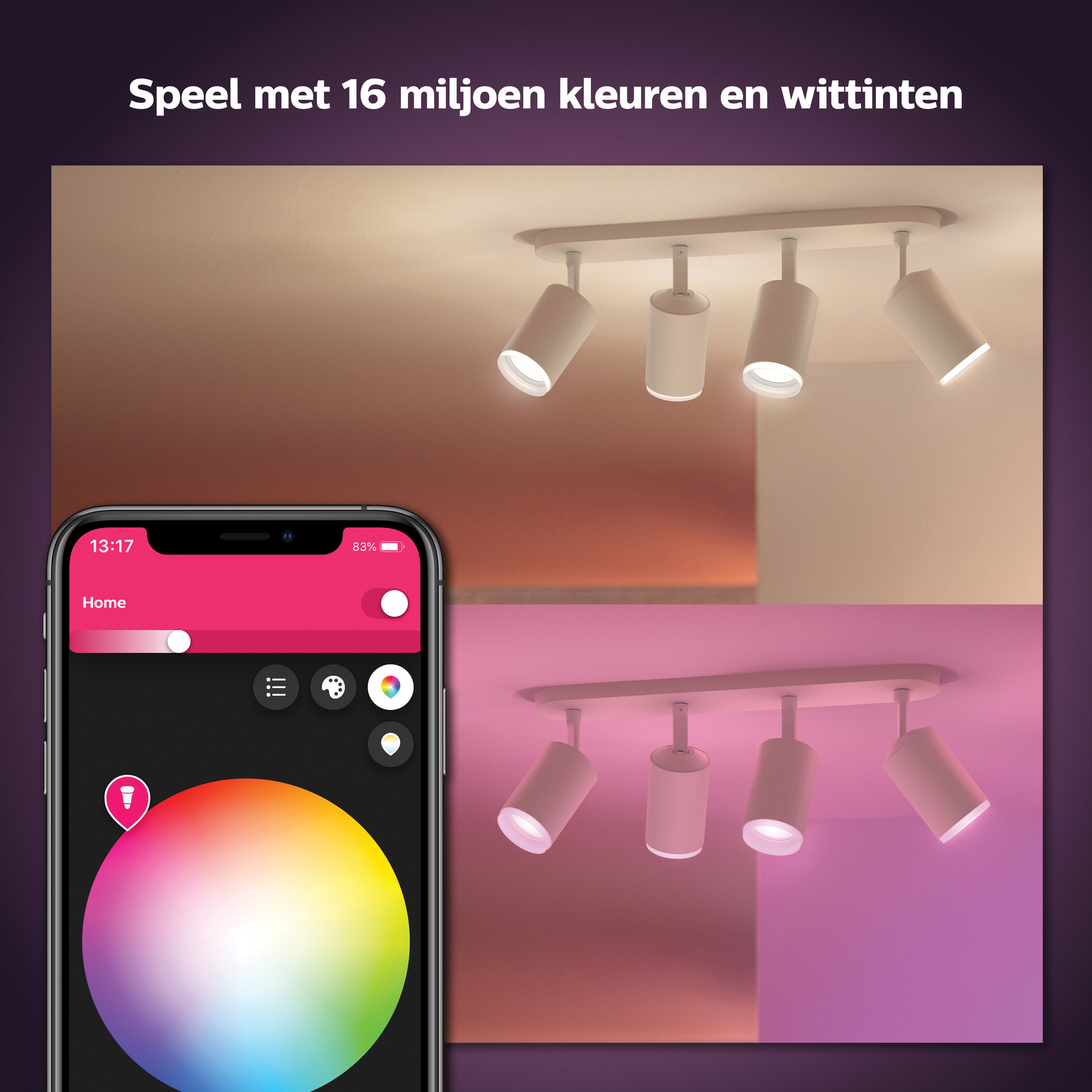 Deze Fugato serie van Philips is opgenomen in de Hue White Ambiance collectie. Deze 4-lichts spot is voorzien van 4 Hue White & Color Ambiance spotjes. De spots zijn te verbinden via Bluetooth of met een bridge. De spots kunnen geschakeld worden met een Switch of met de app. Met Hue kunt u meerdere lampen koppelen en schema’s toevoegen.