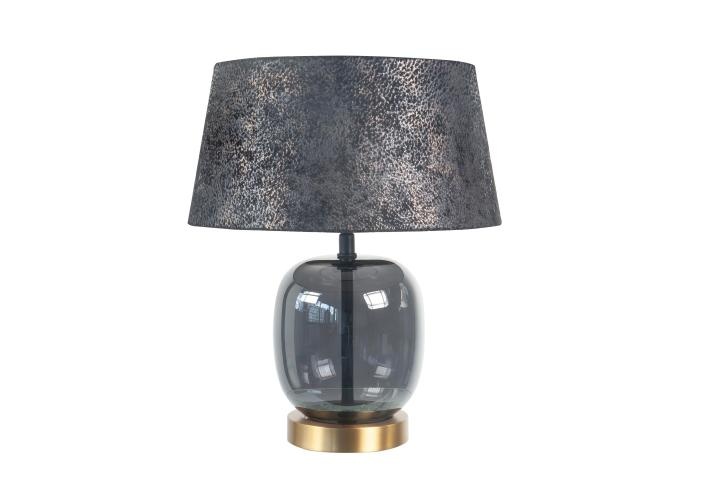 Een nieuwe toevoeging aan de Bellini serie! Het glazen armatuur geeft een moderne twist aan de tafellamp met een chique zwart stoffen lampenkap (afmeting 30-25-15 cm) en een gouden voetplaat.