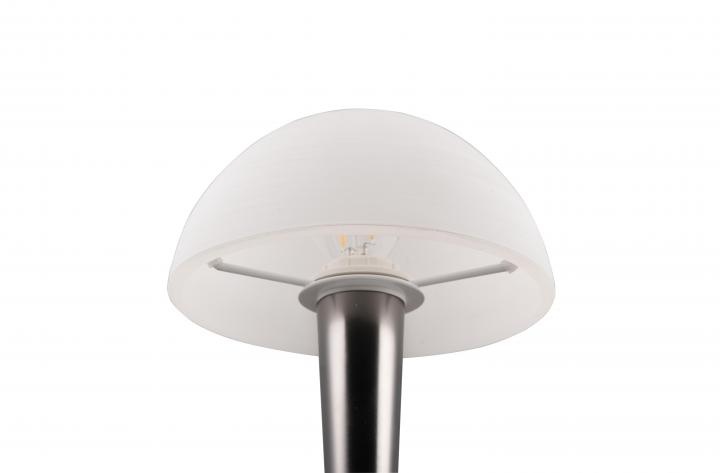 De Canaria tafellamp heeft een modern ontwerp en is gemaakt van metaal. De tafellamp is uitgevoerd in het zwart-chroom en heeft een wit geborstelde kap. Het heeft een diameter van 15 cm en een hoogte van 26,5 cm, waardoor het een compacte lamp is die gemakkelijk in je interieur past.