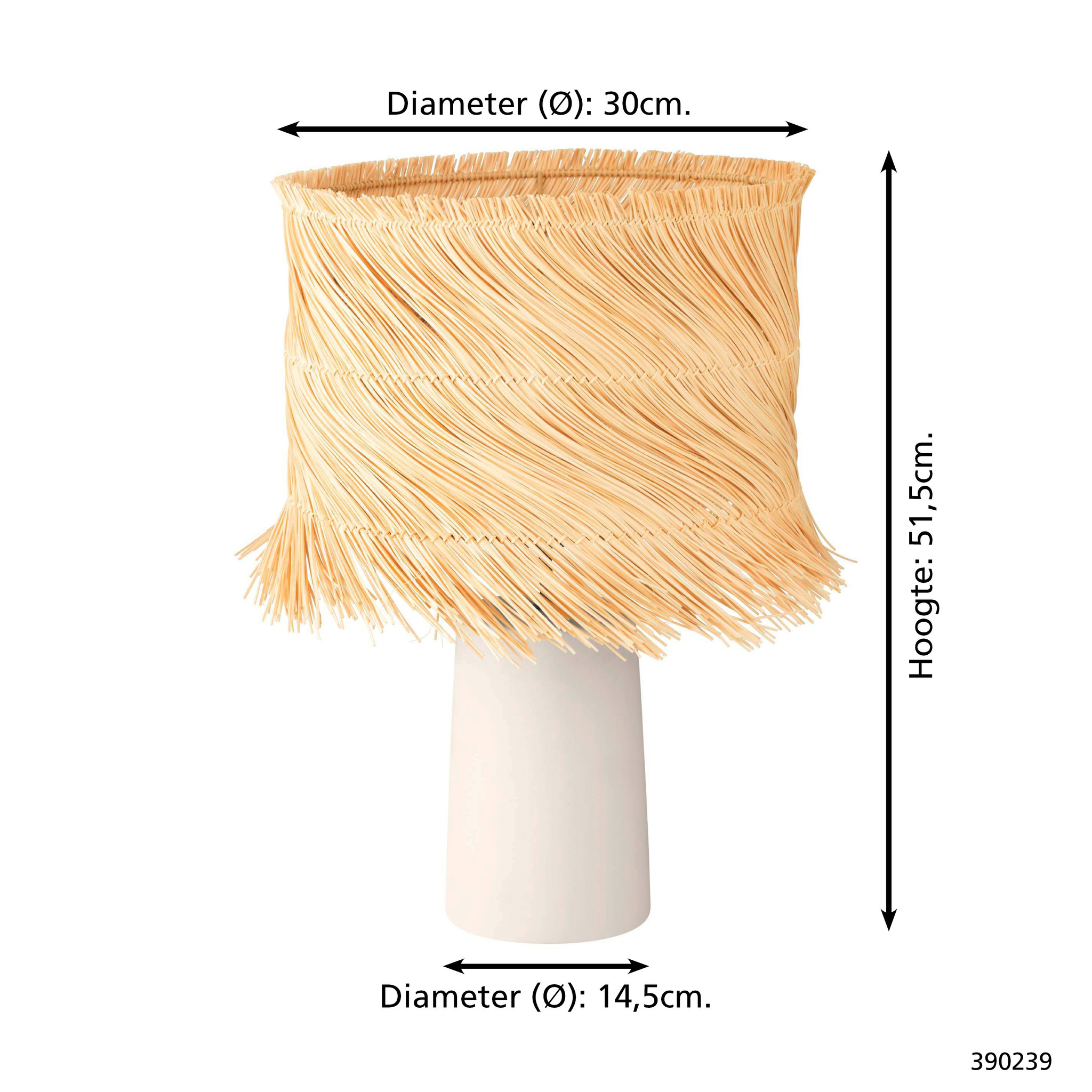Deze tafellamp wordt voorzien van een snoerschakelaar en geleverd exclusief lichtbron en heeft ruimte voor een E27-fitting met een maximaal wattage vermogen van 40 Watt. De lamp is uitgevoerd in ceramiek in de kleur beige en de lampenkap in rotan en afgewerkt in een natuurlijk houten kleur. De Paisano tafellamp heeft een diameter van 30 cm en een hoogte van 51,5 cm.
