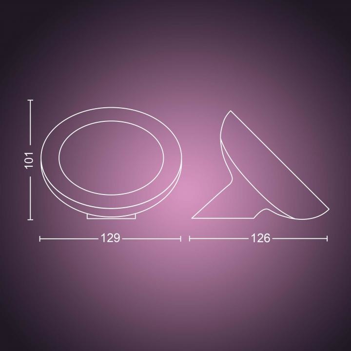 De Bloom is 13 bij 12.6 cm breed. De hoogte van de lamp is 10.1 cm hoog. De lamp is voorzien van een geïntegreerde LED module van 7.1W en een lichtsterkte van 500 Lumen en een kleurtemperatuur van 2000 tot 6500 Kelvin. Deze lamp is uitgevoerd in het wit maar ook te verkrijgen in het zwart.