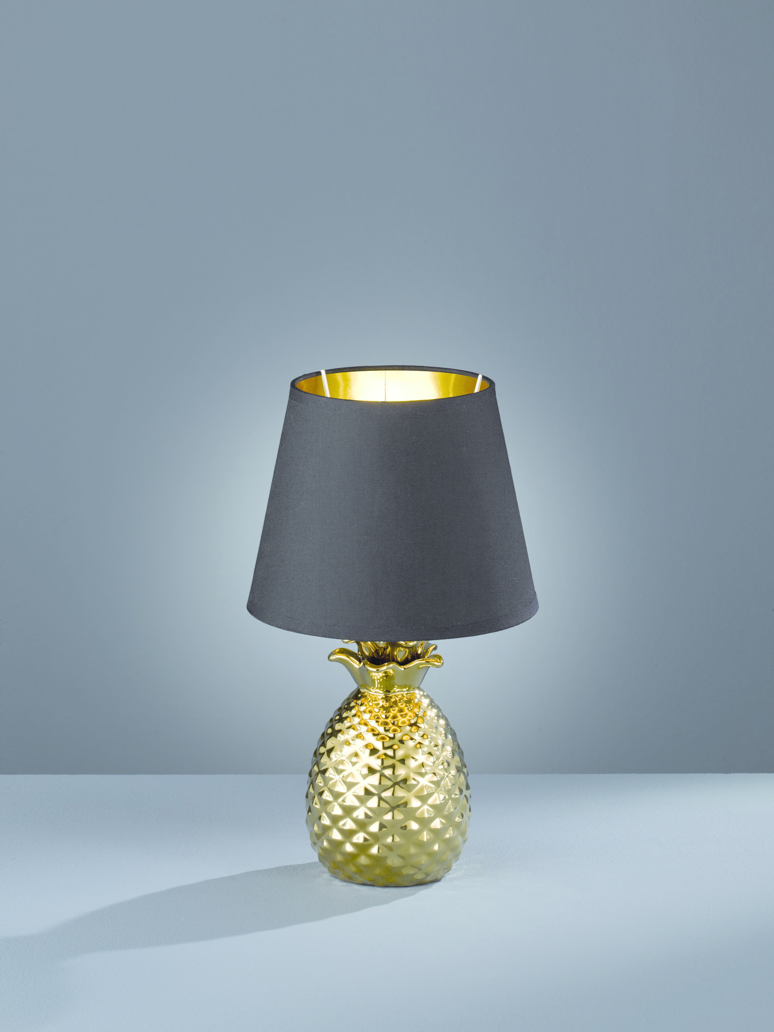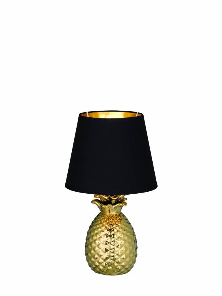 Opvallende en trendy tafellamp uit de Pineapple serie van Trio-Leuchten. Zoals de naam als zegt is de basis van de lamp in de vorm van een ananas. De voet is van keramiek en in het goud gespoten. De stijlvollen kap is zwart met een gouden binnenzijde. Zeker een leuke eyecatcher in uw interieur.