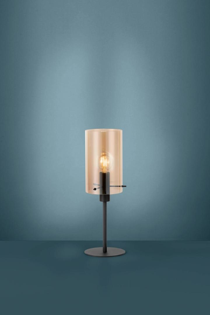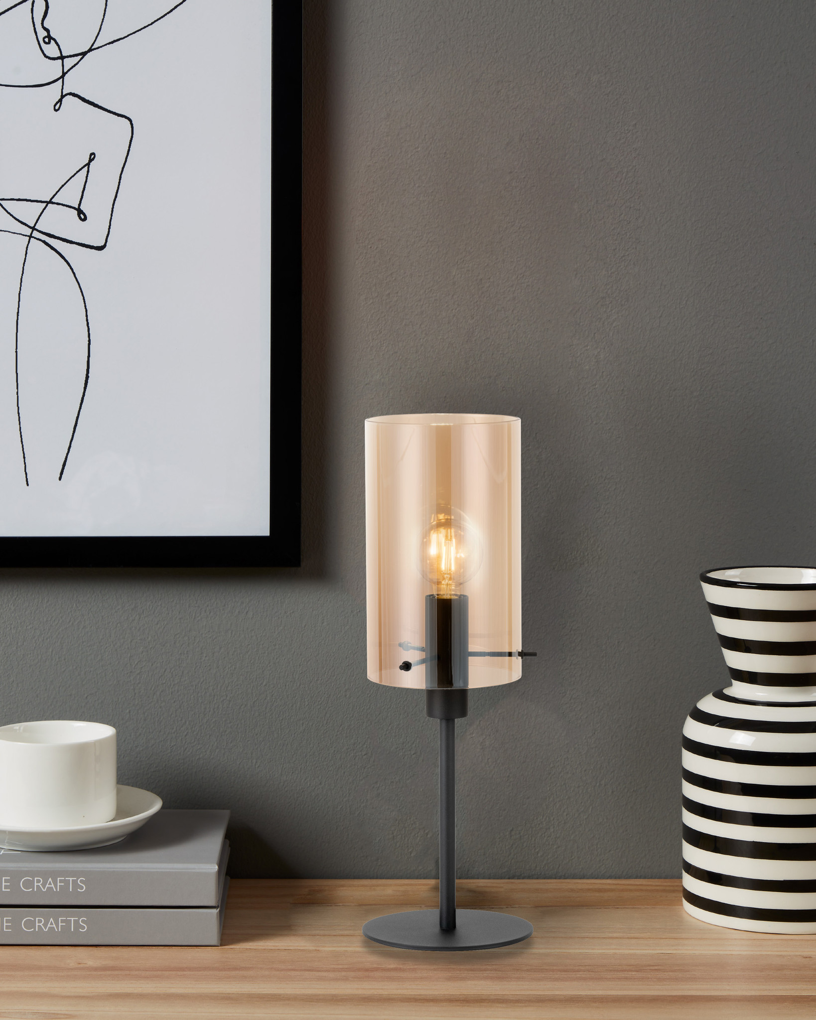 De tafellamp Polverara van Eglo heeft een zwarte stalen voet en amberkleurig glas. Het amberkleurige glas geeft de lamp een chique en warme look.